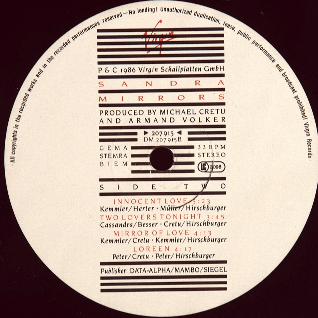 SANDRA-MIRRORS-1986-ПЕРВЫЙ ПРЕСС GERMANY RCA -PL71162. Редкий оригинал диско дивы, Mirrors - второй студийный альбом немецкой певицы Сандры, выпущенный 13 октября 1986 года лейблом Virgin Records. Альбом породил европейские топ-10 синглов "Innocent Love" и "Hi! Привет! Привет!". Альбом попал в топ-20 в Германии, Швейцарии, Финляндии и Норвегии.