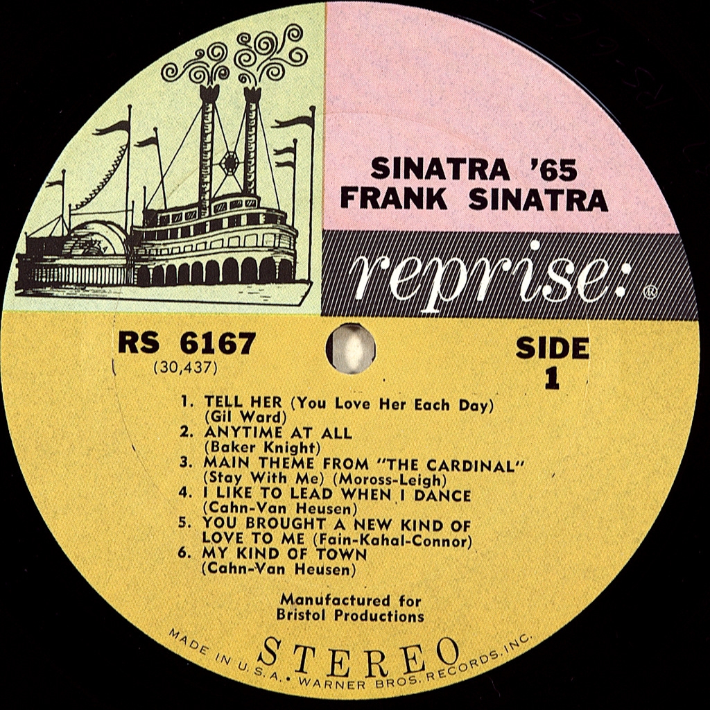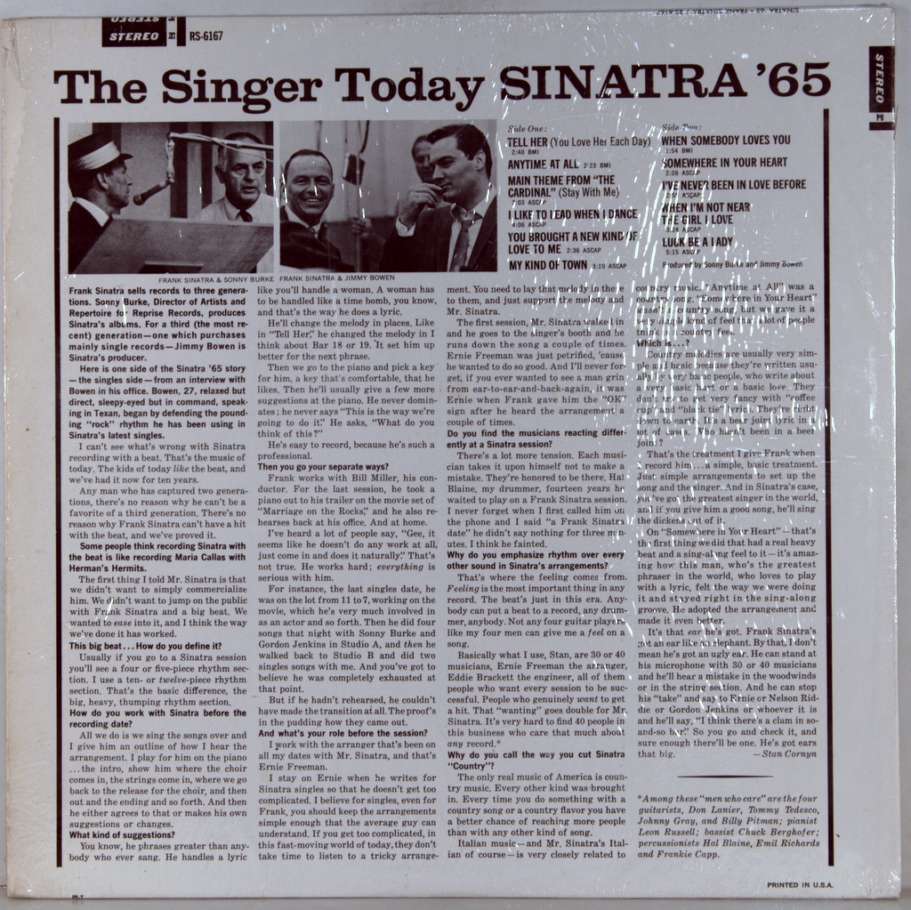 SINATRA, FRANK -SINATRA '65 -1965-ПЕРВЫЙ ПРЕСС (STEREO) USA-REPRISE-RS6167. Редкий американский оригинал культового альбома. Альбом Фрэнка Синатры представляет собой сборник различных синглов и сессий, выделенных хитами "Удача быть леди", "Anytime At All", "Где-то в твоем сердце", "Останься со мной" и "Скажи ей (что любишь ее каждый день)". Представленная здесь версия "My Kind of Town" не является отредактированной версией сингла. Альбом составил сам Фрэнк. Альбом получил высокую оценку музыкальных издательств и критиков..