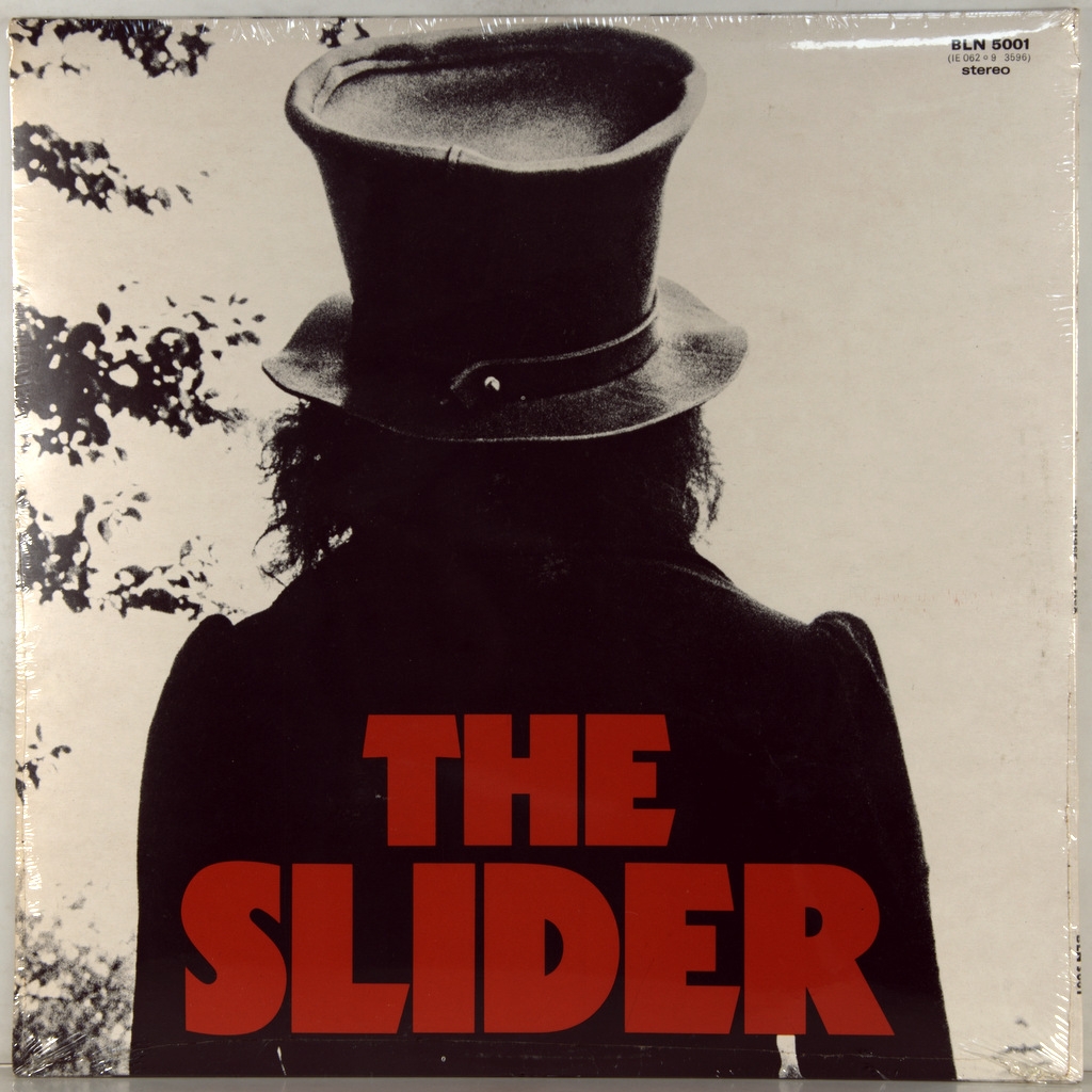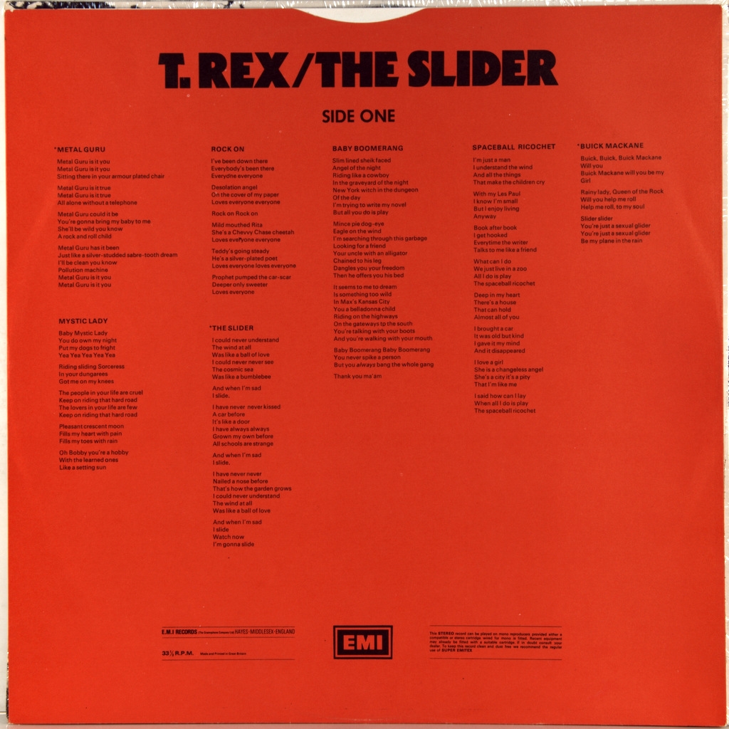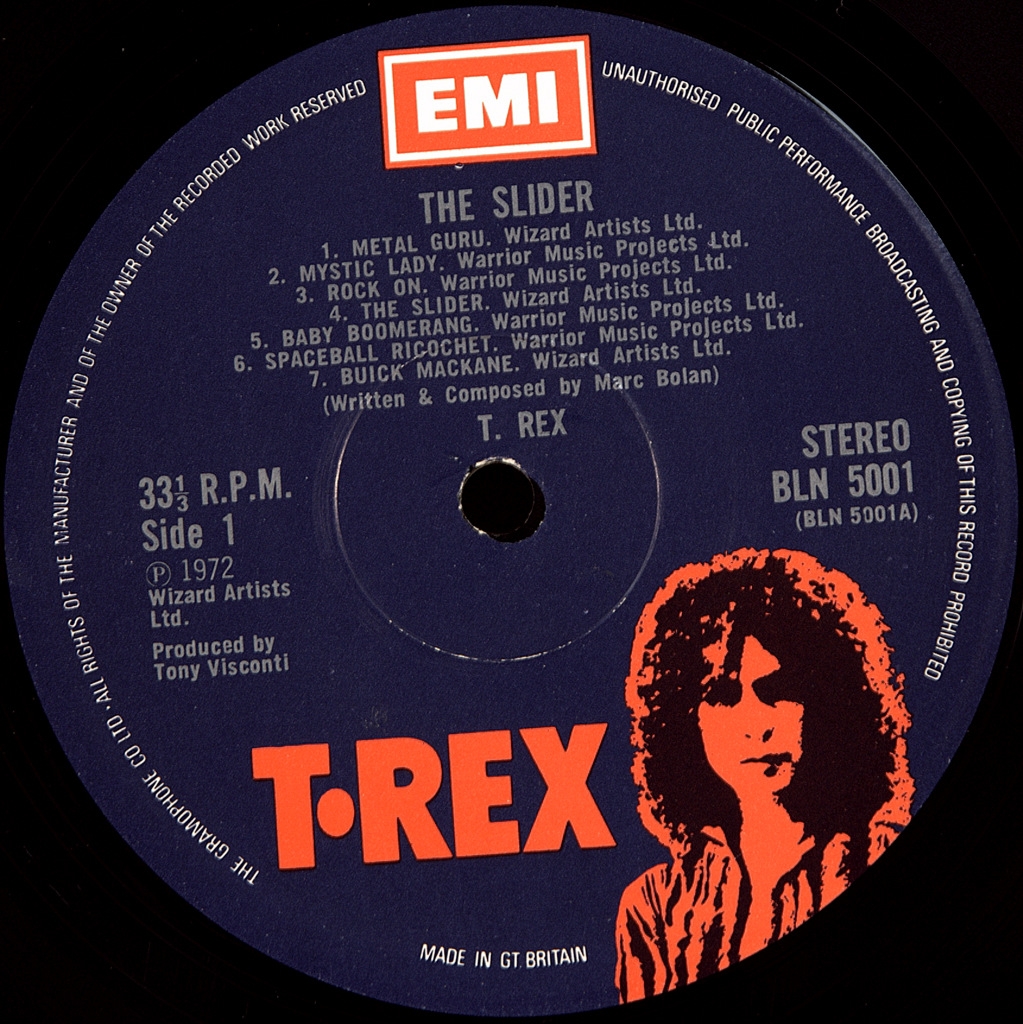 T.REX-THE SLIDER-1972-ПЕРВЫЙ ПРЕСС UK-EMI-BLN-5001. Матрицы A-1U/B-2U .Редкий британский оригинал. Slider- седьмой студийный альбом английской рок-группы T. Rex и третий с тех пор, как их название было сокращено от Tyrannosaurus Rex. Он был выпущен 21 июля 1972 года звукозаписывающими компаниями EMI и Reprise. Для продвижения альбома были выпущены два сингла номер один, "Telegram Sam" и "Metal Guru". Выпущенный на пике популярности группы, альбом Slider получил признание критиков и достиг 4-го места в чарте альбомов Великобритании и 17-го в США.