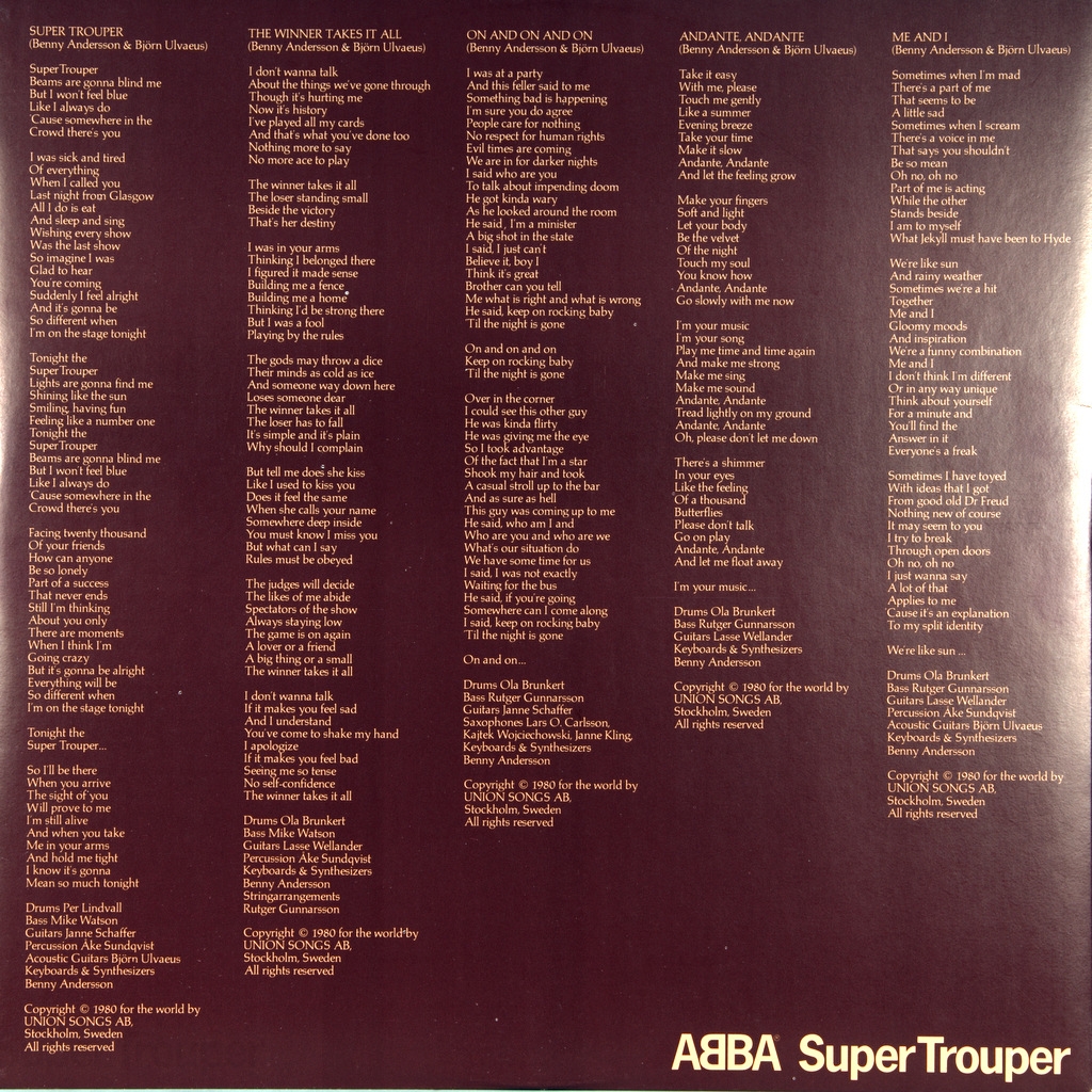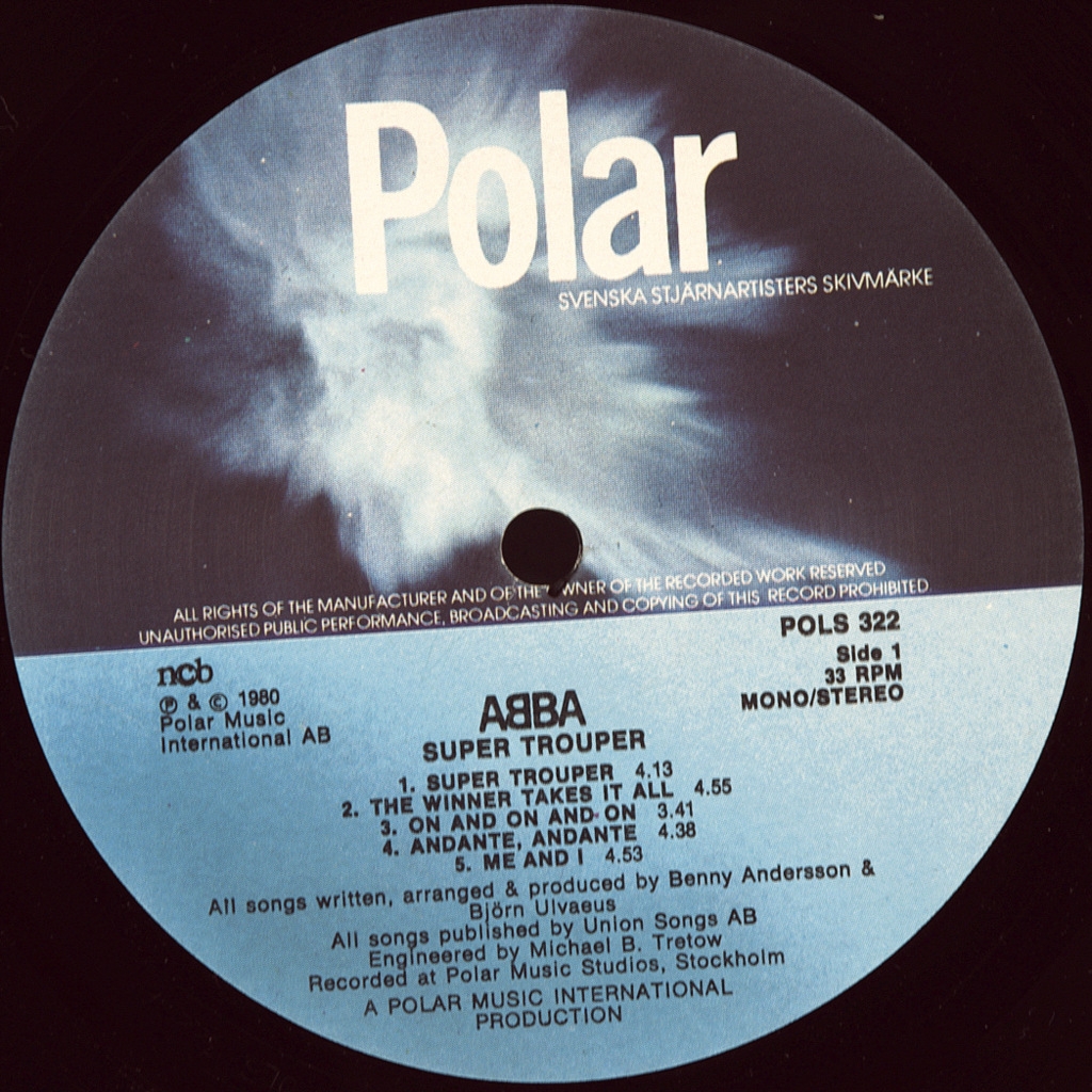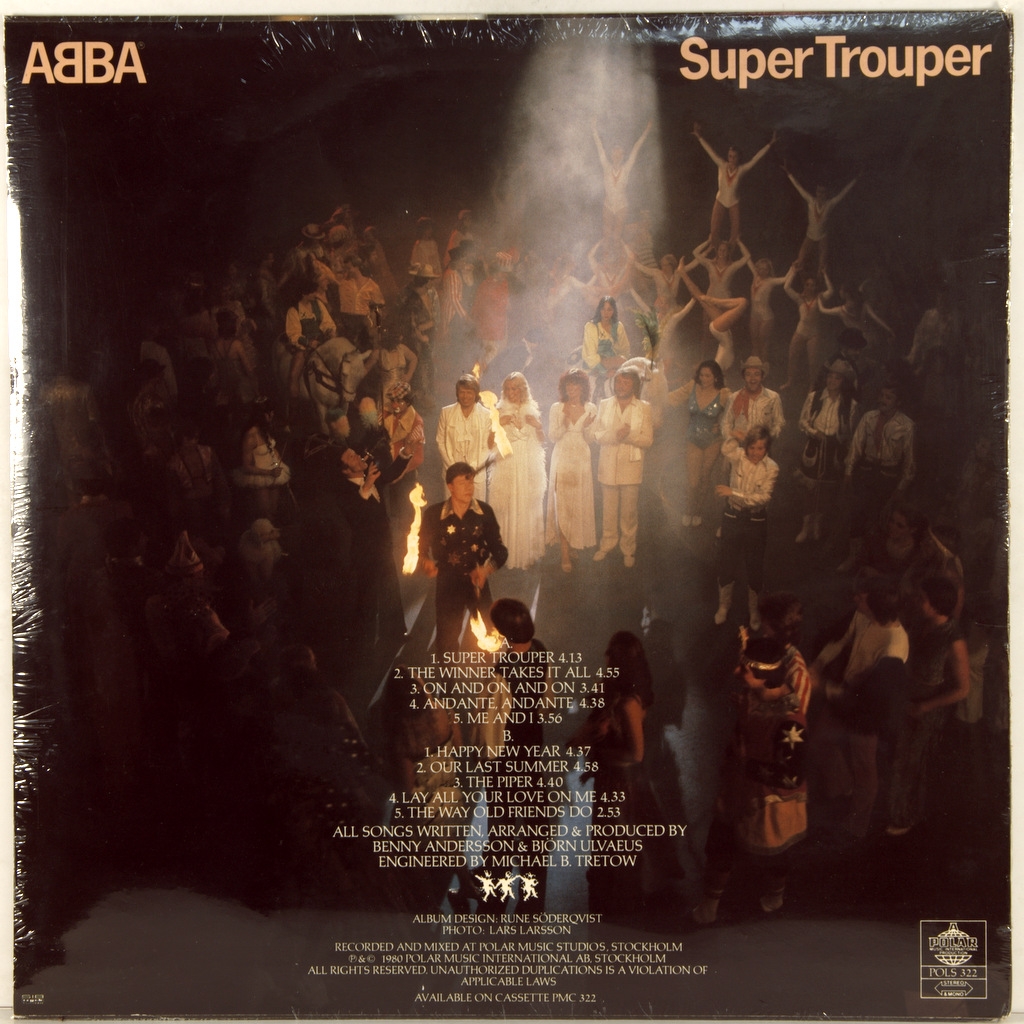 ABBA-SUPER TROUPER-1980-ПЕРВЫЙ ПРЕСС SWEDEN-POLAR -POLS322. Редкий шведский оригинал культового альбома. Super Trouper — седьмой студийный альбом шведской группы ABBA, выпущенный в 1980 году. Он стал шестым альбомом группы, возглавившим британские чарты, а также лидером продаж в Великобритании в 1980 году. В Европе альбом занял места с 1 по 5 во всех странах континента, моментально стал мультиплатиновым.