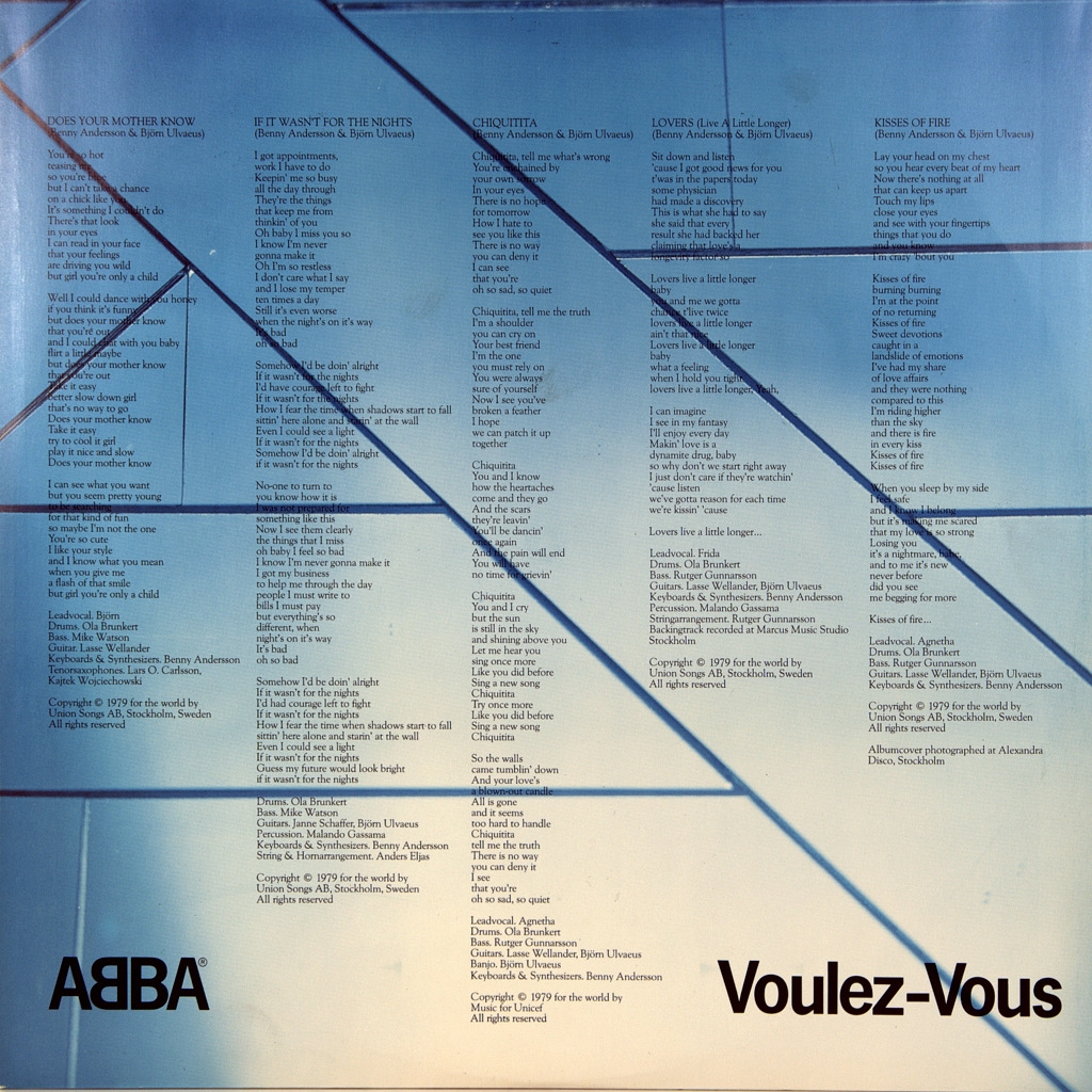 ABBA-VOULEZ-VOUS-1979-ПЕРВЫЙ ПРЕСС SWEDEN-POLAR - POLS282.Редкий шведский оригинал культового альбома. Voulez-Vous — шестой студийный альбом шведской поп-группы ABBA, выпущенный в 1979 году. Релиз характеризуется большим количеством треков танцевальной направленности, однако неправильно определять жанр альбома как исключительно «диско»; так, песня «Does Your Mother Know» имеет вполне определённые рок-мотивы. Работа над альбомом шла более года, и за это время участниками было наработано большее количество материала, чем то, что удалось поместить на альбом. Среди изданных значительно позднее работ того периода следует упомянуть композицию Dream World, включённую как бонусный трек на переиздание 2010 года. В 1981 году альбом «Voulez-Vous» был выпущен в СССР фирмой «Мелодия» и стал последним номерным альбомом «ABBA», вышедшем в Советском Союзе. Альбом как и предыдушие имел огромный успех, разместившийся в чартах всех стран в первой десятки. Только за один год стал мульти-платиновым.