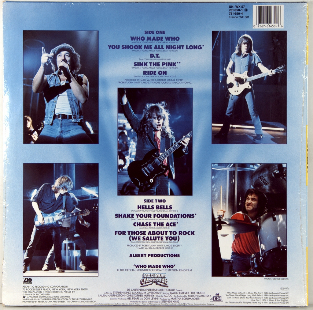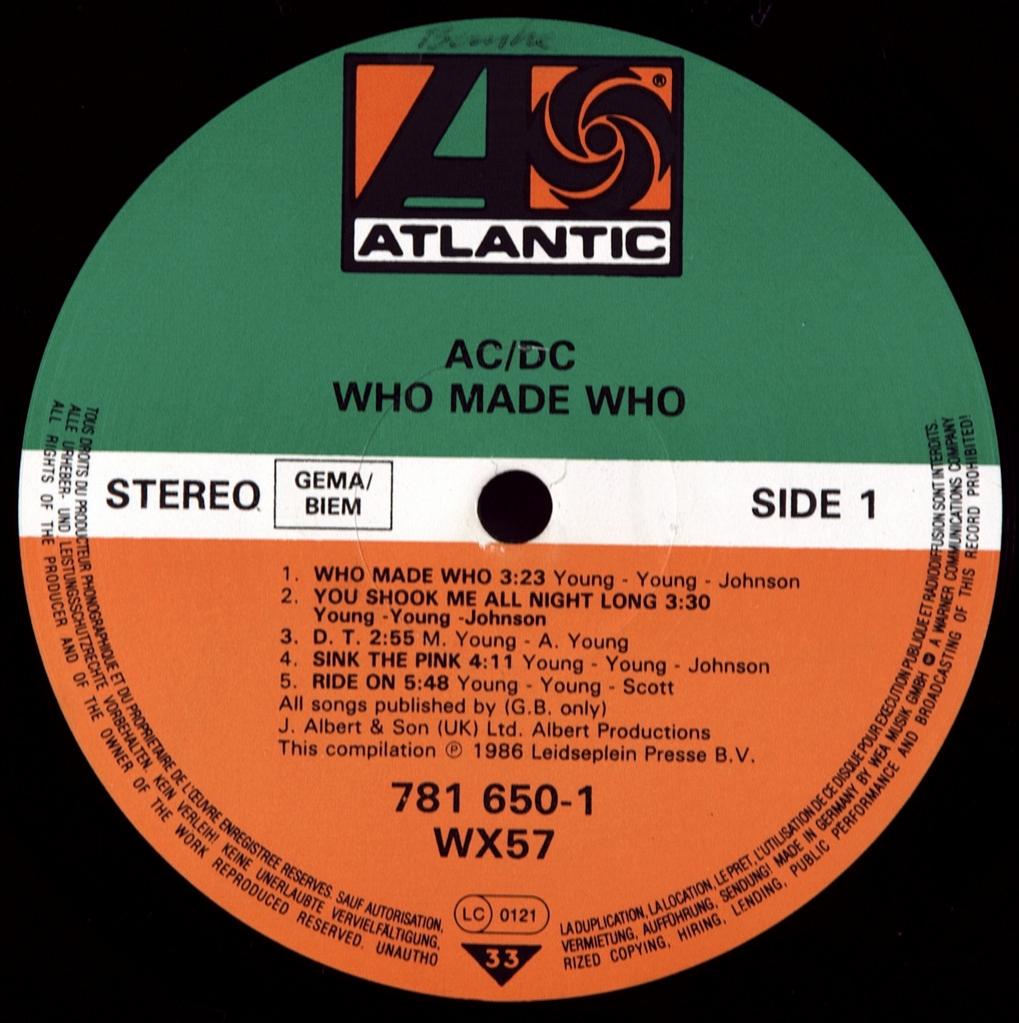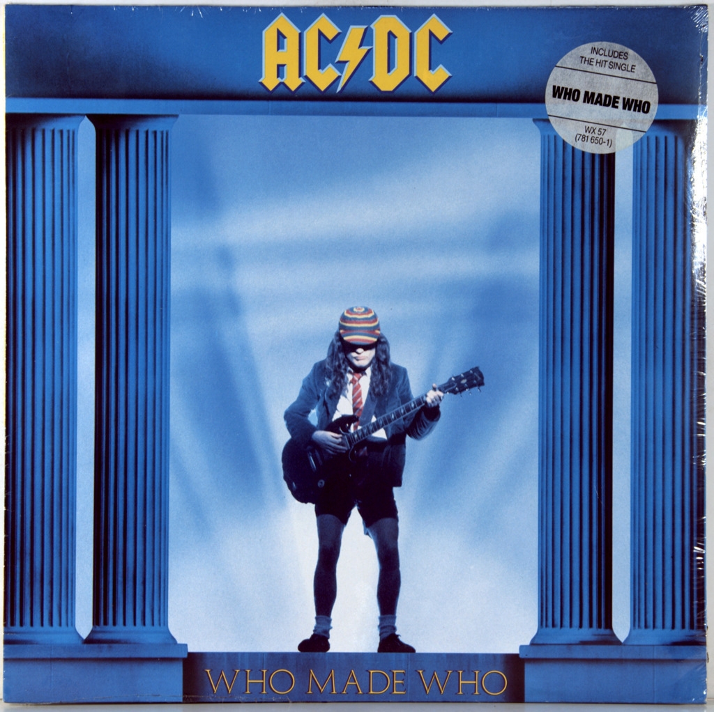 AC/DC-WHO MADE WHO- 1986-ПЕРВЫЙ ПРЕСС UK/EU-GERMANY-ATLANTIC-781650-1. Редкий европейский оригинал, Who Made Who — альбом австралийской хард-рок-группы AC/DC, вышедший в 1986 году как саундтрек к фильму Стивена Кинга «Максимальное ускорение». Who Made Who включает в себя три новых (заглавная песня, а также две инструментальные композиции: «Chase the Ace» и «D.T.») трека, а также старые хиты группы: пять песен периода Брайана Джонсона (две композиции с альбома Back in Black, две из альбома Fly on the Wall, и одну — из альбома For Those About to Rock (We Salute You)) и одна периода Бона Скотта («Ride On» из альбома Dirty Deeds Done Dirt Cheap) Альбом получил относительный успех и позволил группе вернутся в хит-парады после неудачных (по сравнению с Back in Black и For Those About to Rock (We Salute You)) альбомов Fly on the Wall и Flick of the Switch.