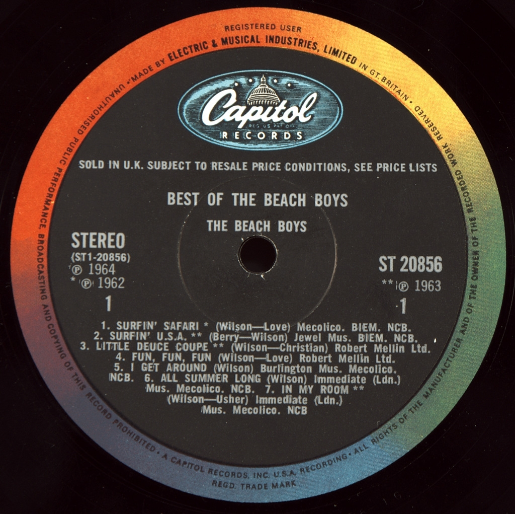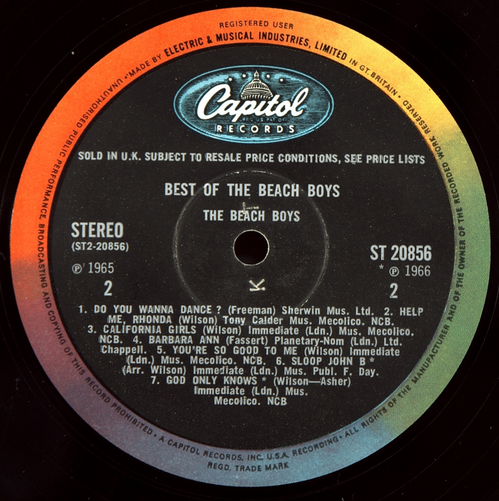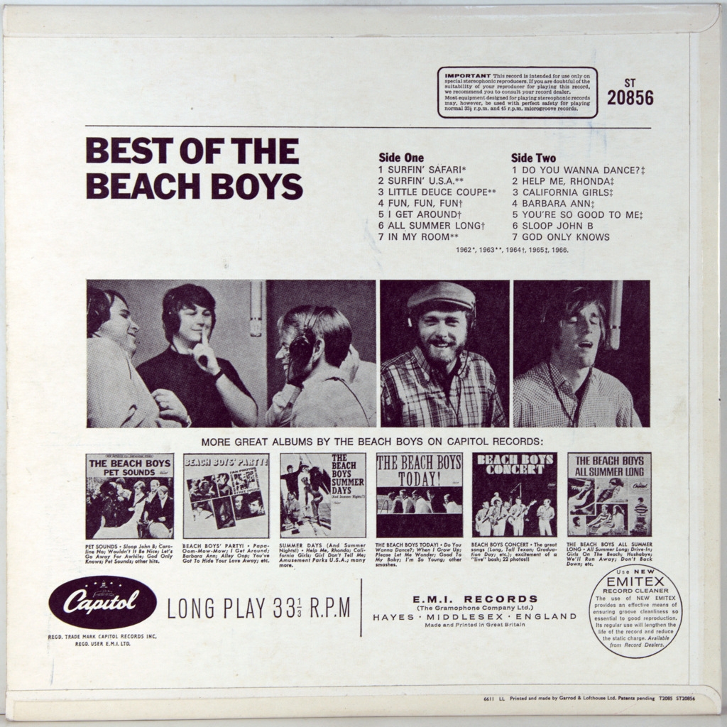 BEACH BOYS - BEST OF-1966-ПЕРВЫЙ ПРЕСС UK-CAPITOL-ST20856 Матрицы A-1G/B-1G. Очень редкий британский оригинал культового альбома. Best of the Beach Boys — первый сборник, выпущенный американской рок-группой The Beach Boys на лейбле Capitol Records в 1966 году. Первая версия была выпущена в США 5 июля 1966 года, через два месяца после Pet Sounds. Другая версия Best of The Beach Boys была выпущена в Великобритании 11 ноября 1966 года с другим списком композиций. Best of The Beach Boys включает подборку из 12 песен в британии 14 , записанных группой с 1962 по 1965 год, многие из которых были синглами или би-сайдами. Альбом занял восьмое место в чартах США и 12 апреля 1967 года получил золотой сертификат RIAA, а 1 декабря 1991 года — двойной платиновый.