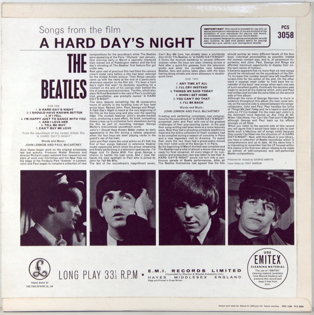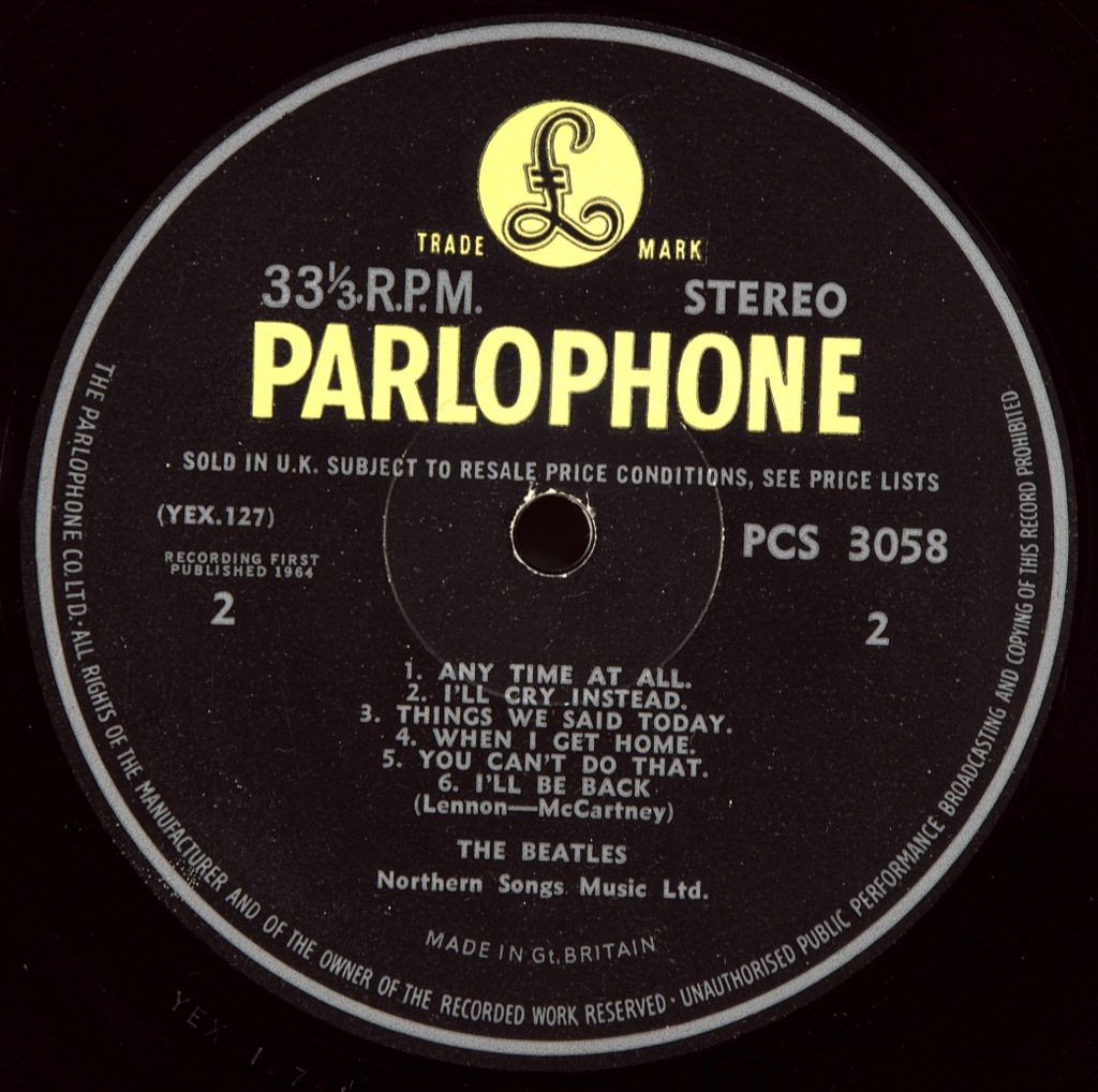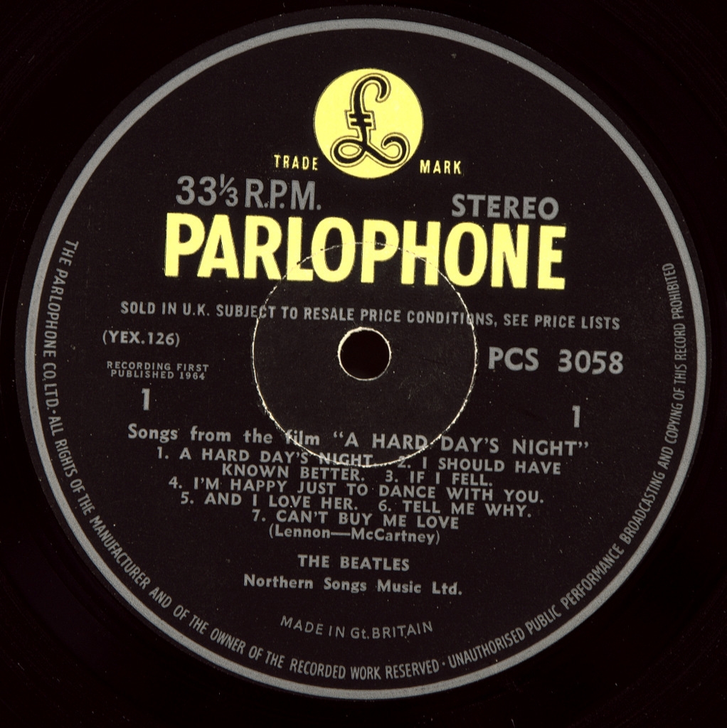 BEATLES-A HARD DAY'S NIGHT (STEREO)-1964-ПЕРВЫЙ ПРЕСС UK-PARLOPHONE-номер PCS 3058. Матричные номера: Сторона 1: YEX 126-1; Сторона 2: YEX 127-1. стампера 2GM/1O (Мечта!)Первый пресс10 июля 1964 года. Черная этикетка с желтым логотипом и серебристым принтом. “ Парлофон Со. ЛТД.” напечатано в начале периметру печати. "Запись впервые опубликована 1964" и "продано в Великобритании на тему..." С или без налогового кодекса КТ на этикетке.