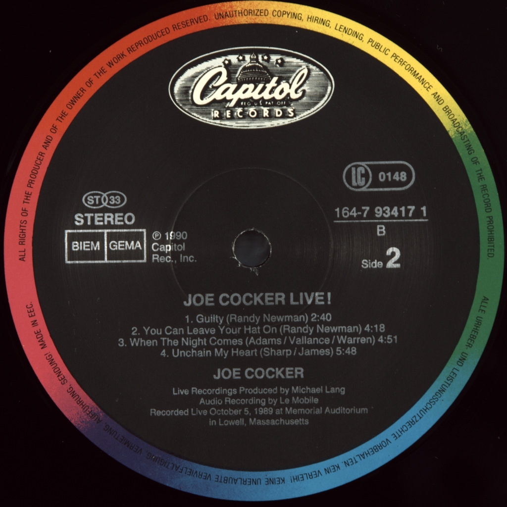COCKER, JOE -LIVE-1990-ПЕРВЫЙ ПРЕСС EEC-CAPITOL- 164-793417-1. Оригинал знаметитого живого альбома JOE COCKER. Joe Cocker Live - концертный альбом Джо Кокера, выпущенный в 1990 году. Он был записан вживую 5 октября 1989 года в Memorial Auditorium в Лоуэлле, штат Массачусетс, за исключением двух последних треков, которые были записаны в студии.В Европе получил статус от золота до платины.