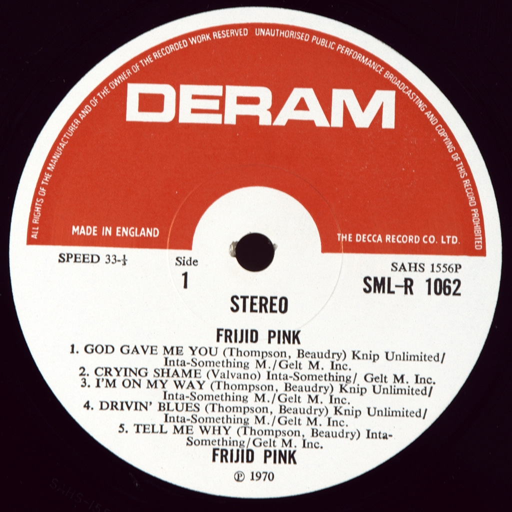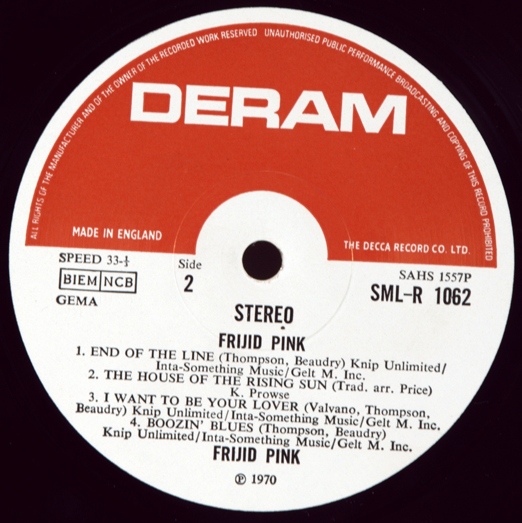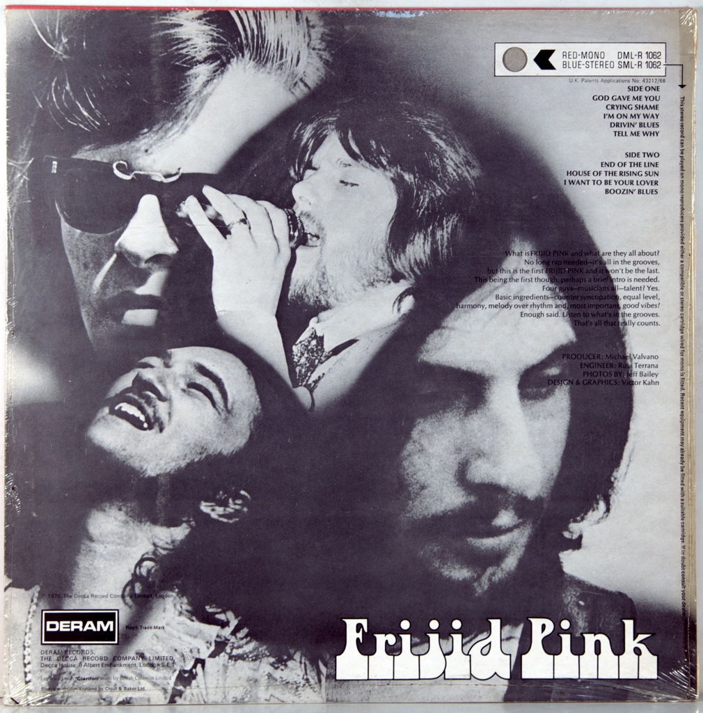 FRIJID PINK -SAME-1970-ПЕРВЫЙ ПРЕСС UK-DERAM-SML-R-1062. Матрицы A-1W/B-1W. Очень редкий британский оригинал культового альбома. В 1967 году Ричард Стиверс и Том Харрис играли в ансамбле "Detroit Vibrations". Гэри Томпсон заменил гитариста, и в состав вошли вокалист Том Бьюдри и гитарист Дэн Йели. В 1969 году группа сменила название на "Frijid Pink" и начала активно концертировать. В конце 1969 года группа выпустила сингл "House Of The Rising Sun", который стал хитом. В начале 1970 года вышел дебютный альбом, занявший 11-е место в Америке и 1-е место в Германии.
