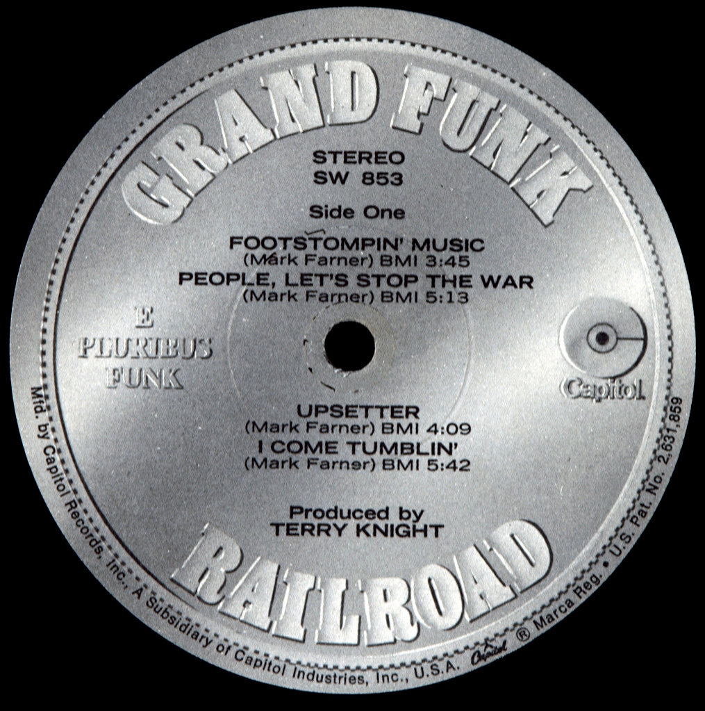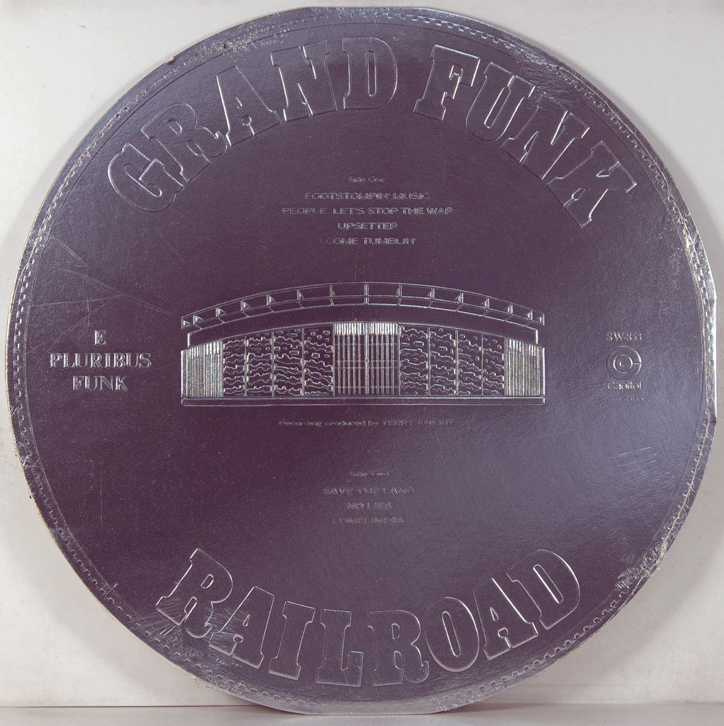 GRAND FUNK RAILROAD-E PLURIBUS FUNK-1972-ПЕРВЫЙ ПРЕСС USA-CAPITOL-SW-853. Редкий американский оригинал культового альбома . E Pluribus Funk - пятый студийный альбом американской рок-группы Grand Funk Railroad. Альбом был выпущен 15 ноября 1971 года лейблом Capitol Records. Как и предыдущие альбомы Grand Funk Railroad, он был записан в Cleveland Recording Company и является последним альбомом, спродюсированным Терри Найтом. Название представляет собой игру на девизе Соединенных Штатов Америки, E pluribus unum, и на латыни означает "Из многих, Фанк". Оригинальная выпускная крышка (дизайн Эрни Чефалу) была совершенно круглой и покрыта серебристой пленкой, напоминавшей большую монету. Задняя сторона обложки этого альбома включала в себя литое изображение стадиона Ши. Альбом был очень успешным разместившись в чартах второй десятке многих стран.