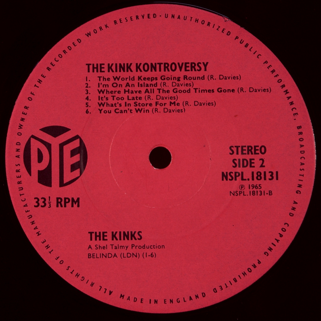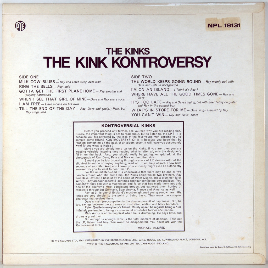 KINKS- KONTROVERSY-1965-ПЕРВЫЙ ПРЕСС (STEREO)UK-PYE-NSPL18131359 Матрицы A-2/B-2 . Очень редкий оригинал культового альбома The Kink Kontroversy — третий студийный альбом английской рок-группы The Kinks. Он был выпущен в Соединённом Королевстве 26 ноября 1965 года лейблом Pye Records. Выпущенный в Соединённых Штатах 30 марта 1966 года лейблом Reprise Records, он стал первым американским альбомом The Kinks с таким же списком композиций, как и у его британского аналога. Это переходный альбом, содержащий элементы как более ранних стилей Kinks (песни с сильным влиянием блюза, такие как "Milk Cow Blues" и вариации на темы хитов группы с 1964 по 1965 год, основанных на пауэр-аккордах, таких как "До конца дня"), так и ранние указания на будущее направление стилей написания песен Рэя Дэвиса ("The World Keeps Going Round" и "I'm on an Island"). Примечания к заголовку были написаны Майклом Олдредом. Сингл «Till the End of the Day» стал настоящим хитом, заняв 8-е место в Великобритании и 50-е в США, продержавшись в каждом чарте восемь недель или больше.