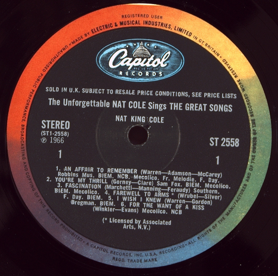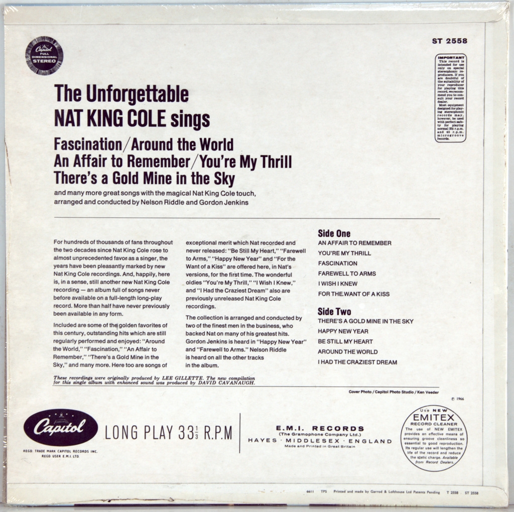 NAT KING COLE-UNFORGETTABLE NAT COLE SINGS GREAT SONGS-1966-ПЕРВЫЙ ПРЕСС UK-CAPITOL-ST2558. Редкий оригинал золотого баритона 20 века. Альбом 1966 года Нэта Кинга Коула, аранжированный Рельсом Ридлом. Альбом занял 8-ю строчку в чарте альбомов Billboard и получил платиновый статус.