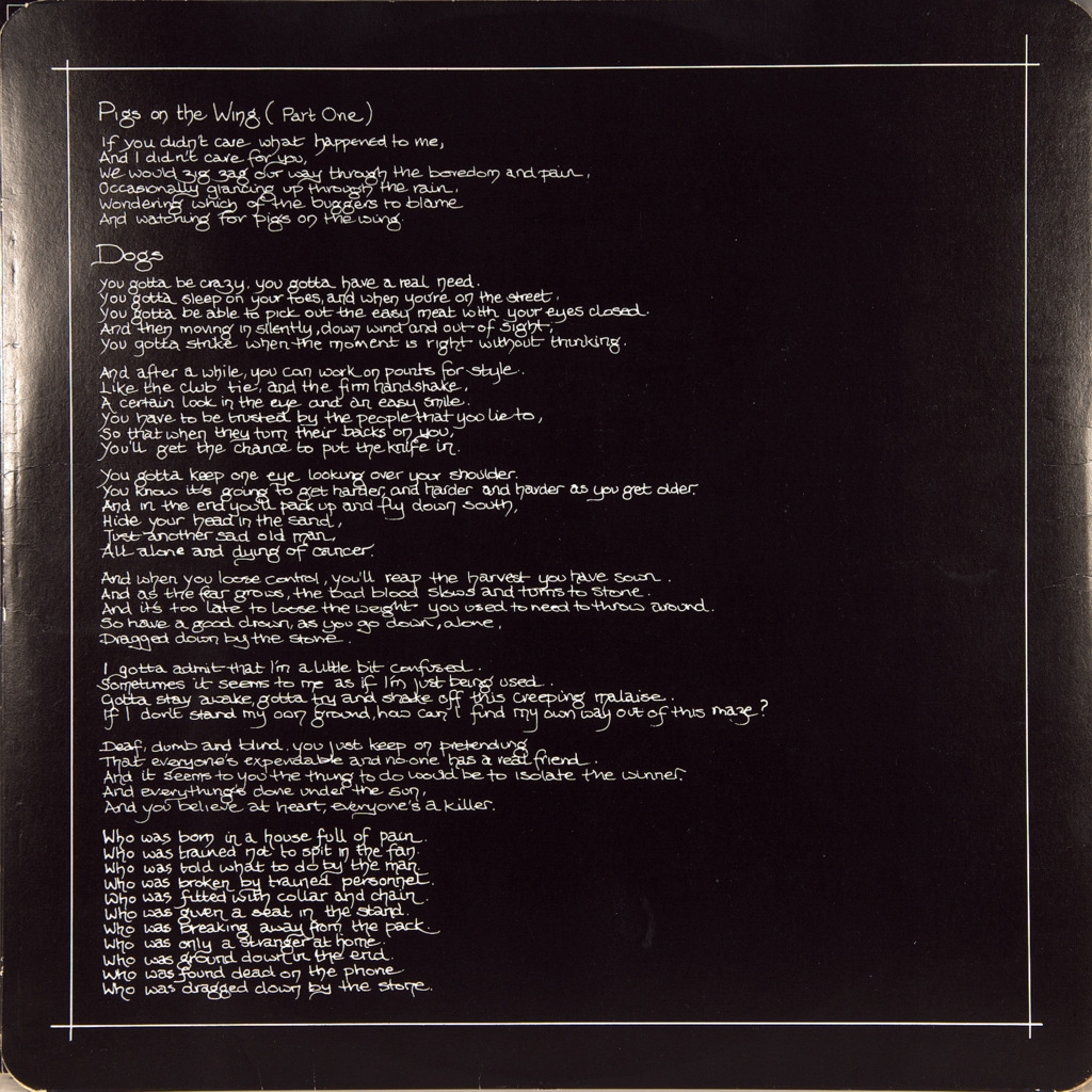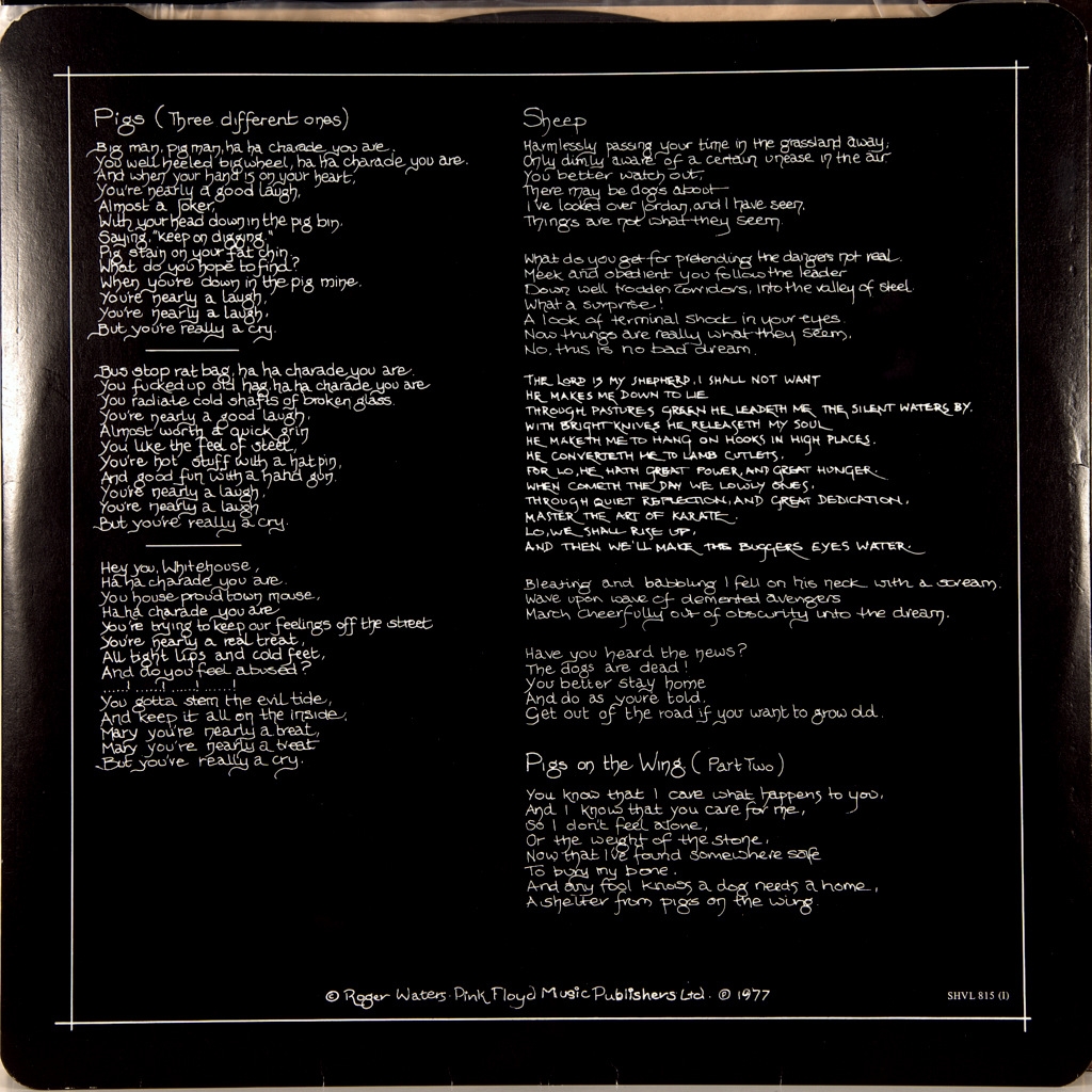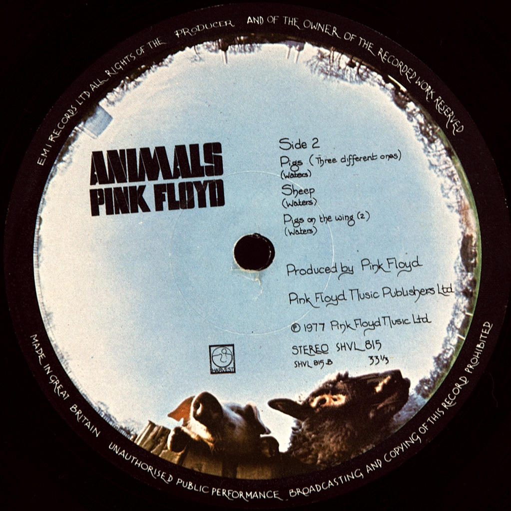 PINK FLOYD-ANIMALS-1977-ПЕРВЫЙ ПРЕСС UK-HARVEST - SHVL815 матрицы A-2U/B-2U. Очень редкий оригинал с первыми матрицами. Animals — десятый студийный альбом британской прогрессив-рок-группы Pink Floyd, выпущенный 23 января 1977 года. Записан в студии «Британиа роу» (Britannia Row Studios) (Лондон). Достиг второго места в хит-параде Великобритании и третьего в США. Первоначально альбом был издан в Великобритании 23 января 1977 года на лейбле Harvest Records, затем на Columbia Records в США 2 февраля 1977 года.Альбом занимает 14 место в списке «25 лучших классических альбомов прогрессивного рока» по версии PopMatters.