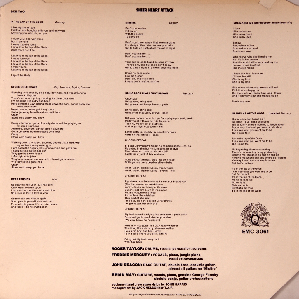 QUEEN-SHEER HEART ATTACK-1974-ПЕРВЫЙ ПРЕСС UK-EMI - EMC3061. Матрицы A-3U/B-4U. Редкий британский оригинал. Первая известность, равно как и коммерческий успех, пришла к группе именно с этой пластинкой, а песня «Killer Queen» стала их первым громким хитом, достигнув второго места в Англии. Сам альбом также достиг второго места в британском и 12-го в чартах Биллборд 1975 года.