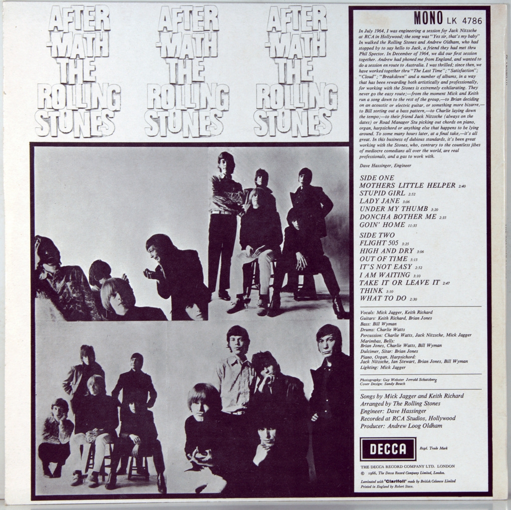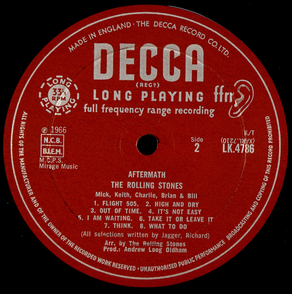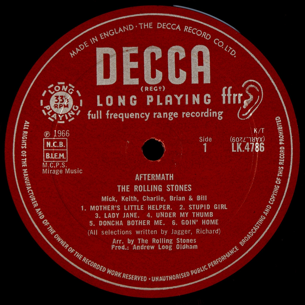 ROLLING STONES-AFTERMATH -1966-ПЕРВЫЙ ПРЕСС(МОNО) UK-DECCA - LK4786 матрицы XARL-7209-1В/XARL-7210-1A стампера 1I/1M (Мечта!) Aftermath — четвёртый британский и шестой американский студийный альбом британской рок-группы The Rolling Stones, изданный в двух вариантах. Британская версия пластинки (Decca Records) увидела свет 15 апреля 1966 года, предназначенная для продаж в США (London Records) — 20 июня. Диск выдержан в классическом для группы ритм-н-блюзовом стиле, однако он стал более «экспериментальным», нежели его предшественники; так, в ряде песен использованы такие нестандартные для рок-музыки инструменты, как ситар, гармонь и маримба (африканский ксилофон). Считается, что запись Aftermath стала одной из важнейших вех в творчестве коллектива. В 2002 году альбом был включён в список 500 величайших альбомов всех времён по версии журнала Rolling Stone под номером 108