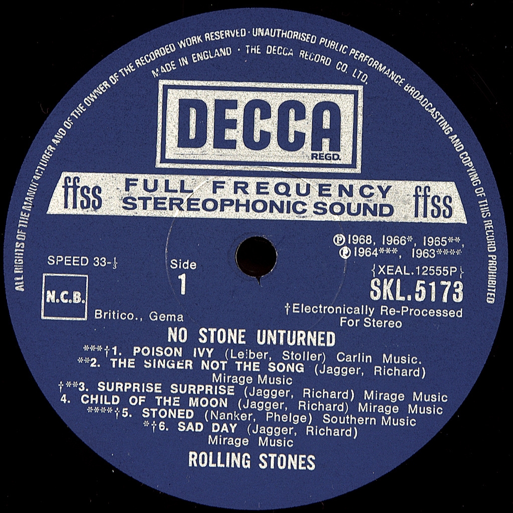 ROLLING STONES-NO STONE UNTURNED-1973-ПЕРВЫЙ ПРЕСС UK-DECCA-SKL5173. Редкий британский оригинал культового альбома. No Stone Unturned- это альбом-компиляция группы The Rolling Stones, выпущенный в 1973 году. Восемь из двенадцати треков ранее были выпущены на одиночных би-сайдах в Соединенном Королевстве, а остальные - на EPS. Песня "Sad Day" была выпущена как сингл с альбома. Ни альбом, ни сингл "Sad Day" не были выпущены с согласия группы, которая потеряла контроль над своим каталогом, выпущенным до 1971 года, когда расторгла контракт с Decca Records..