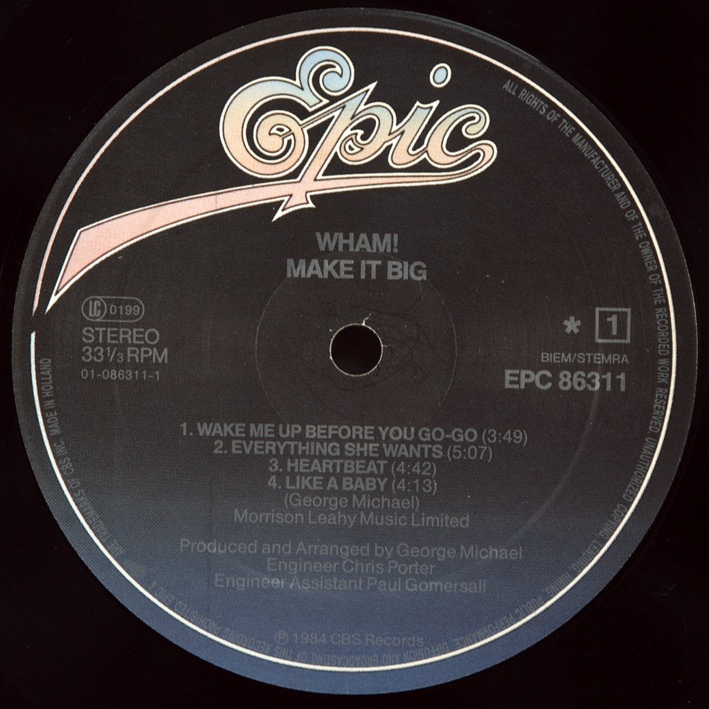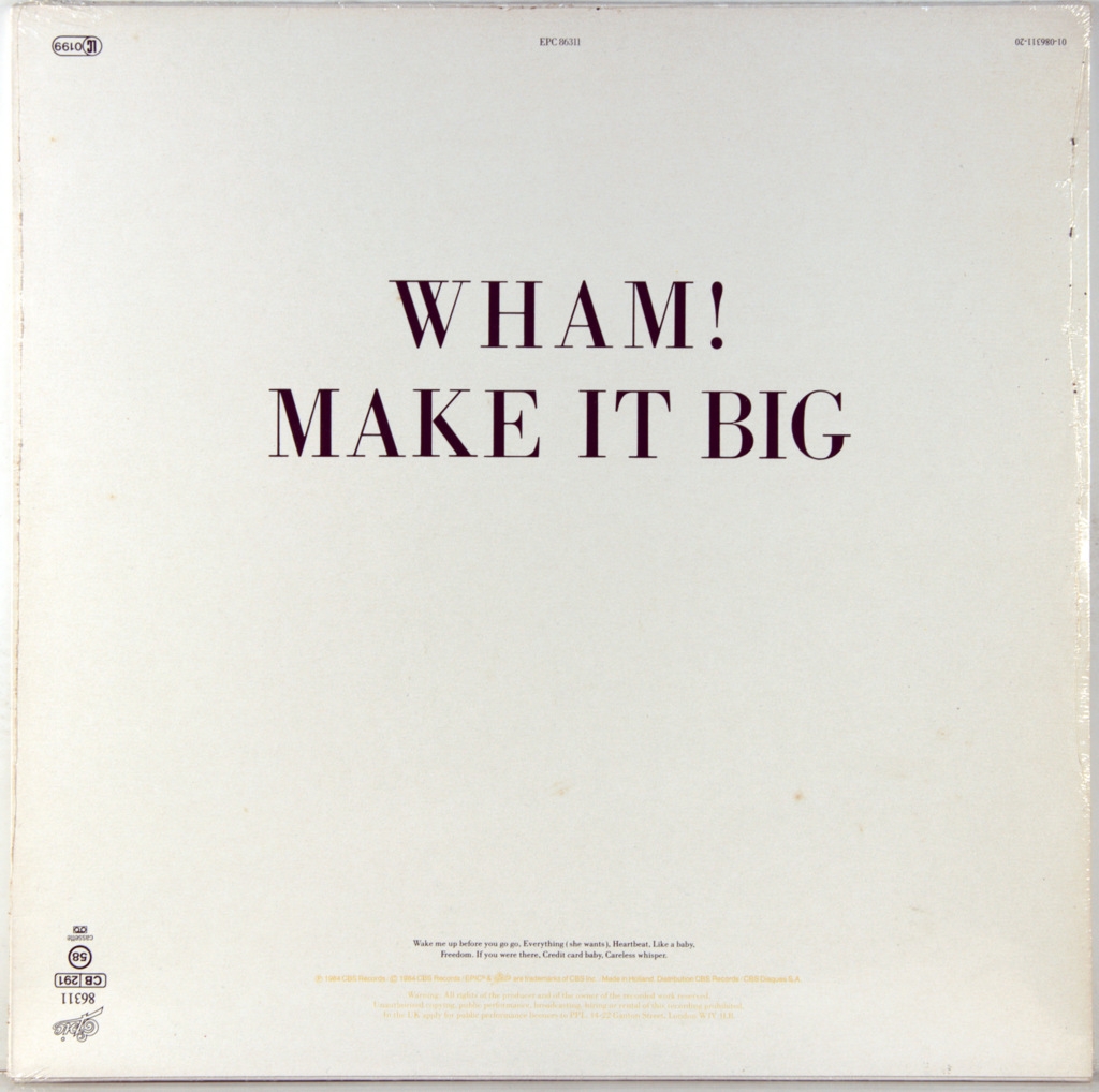 WHAM (GEORGE MICHAEL AND ANDREW RIDGELEY) - MAKE IT BIG (+POSTER)-1984-ПЕРВЫЙ ПРЕСС UK/EU-HOLLAND -EPIC-EPC86311. Make It Big — второй студийный альбом английского поп-дуэта Wham!, выпущенный в 1984 году. По сравнению с их предыдущими работами, Wham! (Джордж Майкл и Эндрю Риджли) получили больше контроля над продюсированием альбома, и Майкл также был указан в качестве продюсера. Альбом имел коммерческий успех, заняв первое место в чартах США и Великобритании и породив четыре сингла, которые вошли в тройку лучших в США и Великобритании. Make It Big стал 4-кратным платиновым альбомом в США во время своего выхода и с тех пор стал 6-кратным платиновым альбомом в США