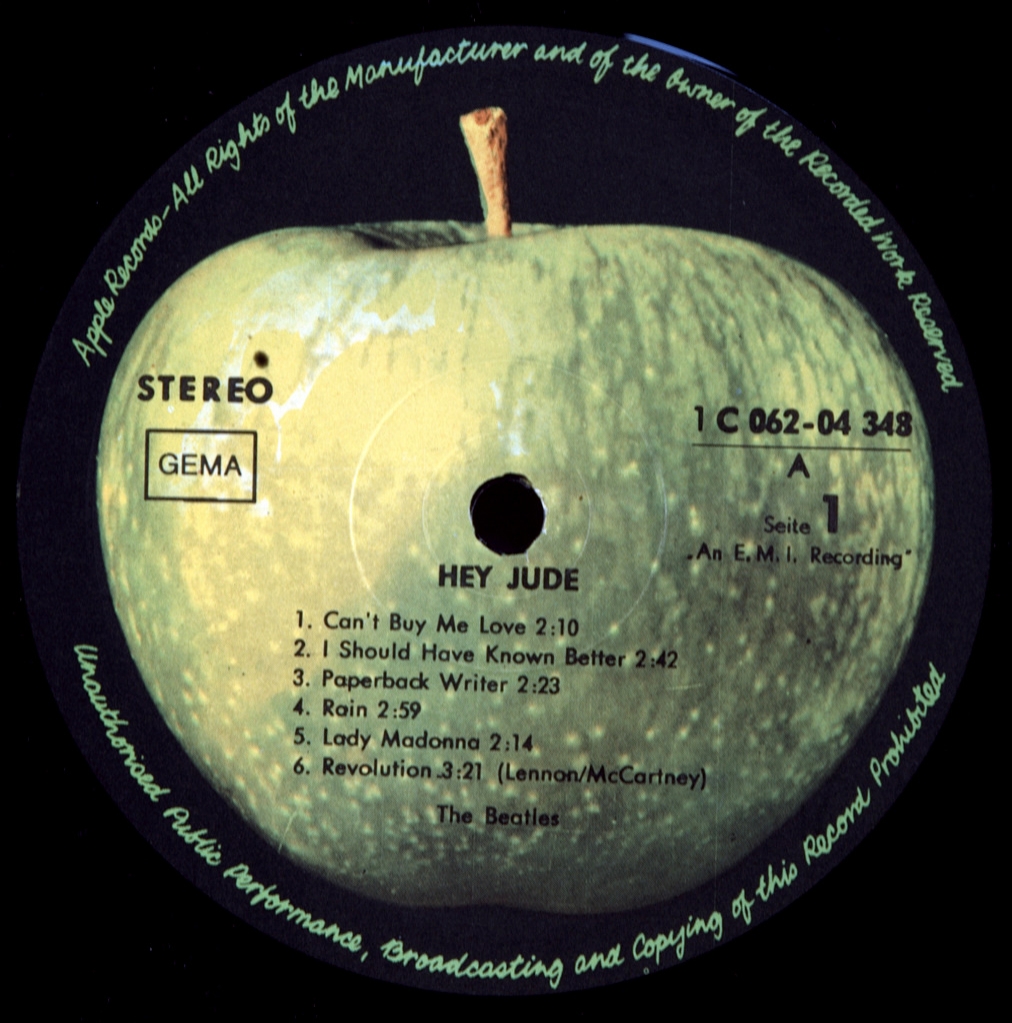 BEATLES-HEY JUDE-1970- ПЕРВЫЙ ПРЕСС GERMANY - UK-APPLE-1C062-04348. Hey Jude или The Beatles Again — компиляционный альбом The Beatles, вышедший в 1970 году в США. В сборник вошли синглы, ранее не издававшиеся на альбомах; стороны «Б» синглов; а также песни «I Should Have Known Better» и «Can't Buy Me Love», ранее изданные в формате синглов лейблом Capitol Records. В чарте Billboard 200 альбом поднялся до второго места.