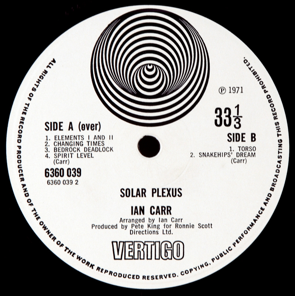 IAN CARR WITH NUCLEUS-SOLAR PLEXUS-1971-ПЕРВЫЙ ПРЕСС UK-VERTIGO SWIRL-6360039. Мега редкий оригинал культового джаз-рок прогрессивного британской группы. Solar plexus- третий альбом легендарных музыкантов. На предыдущих двух альбомах Nucleus основным сочинителем выступал Карл Дженкинс. Теперь бразды правления решил, наконец, взять бэндлидер Иен Карр, единолично написавший весь материал для этого альбома. В результате его концептуального подхода более стихийные, грувовые композиции (напоминающие о втором альбоме группы) чередуются с более статичными и "композиторскими" (в духе первого диска). Таким образом, материал здесь получился хотя и без ярких тем (Дженкинса превзойти не удалось), но более сбалансированный и качественный, чем на предыдущем диске. Да, вполне можно пенять Карру, что его игра лишена майлзовских эмоциональных глубин, но и у него, и у остальных дядек из Nucleus есть и индивидуальность и серьезный уровень мастерства, который при этом не убивает музыку. При всей серьезности амбиций, это очень живой, разнообразный и подвижный джаз-рок с хорошей игрой. По части подвижности отдельный респект надо выразить барабанщику Джону Маршаллу - слушать его всегда интересно. Гитарист Крис Спеддинг солирует немного, однако мастерски поддерживает качающие ритмы. Особенно хороша финальная 15-минутная Snakehips Dream: классный грув и настоящее раздолье для всех музыкантов - и слушателей.