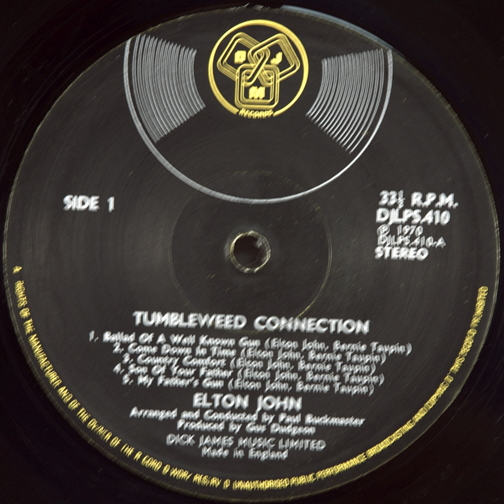JOHN, ELTON-TUMBLEWEED CONNECTION-1970-ПЕРВЫЙ ПРЕСС UK-DJM-DJLPS410 Редкий британский оригинал культового альбома Tumbleweed Connection — третий студийный альбом английского певца и автора песен Элтона Джона. Он был записан в Trident Studios в Лондоне в марте 1970 года и выпущен в октябре 1970 года в Великобритании и в январе 1971 года в США. Это концептуальный альбом, основанный на темах кантри и вестерна и американа. Все песни написаны Джоном и Берни Топином, за исключением «Песни о любви» Лесли Дункана. В 2012 году Tumbleweed Connection занял 458-е место в списке 500 величайших альбомов всех времён по версии журнала Rolling Stone. Альбом занял второе место в чарте UK Albums Chart и пятое место в чарте Billboard 200 в США. В США он получил золотой статус в марте 1971 года и платиновый статус в августе 1998 года от RIAA.