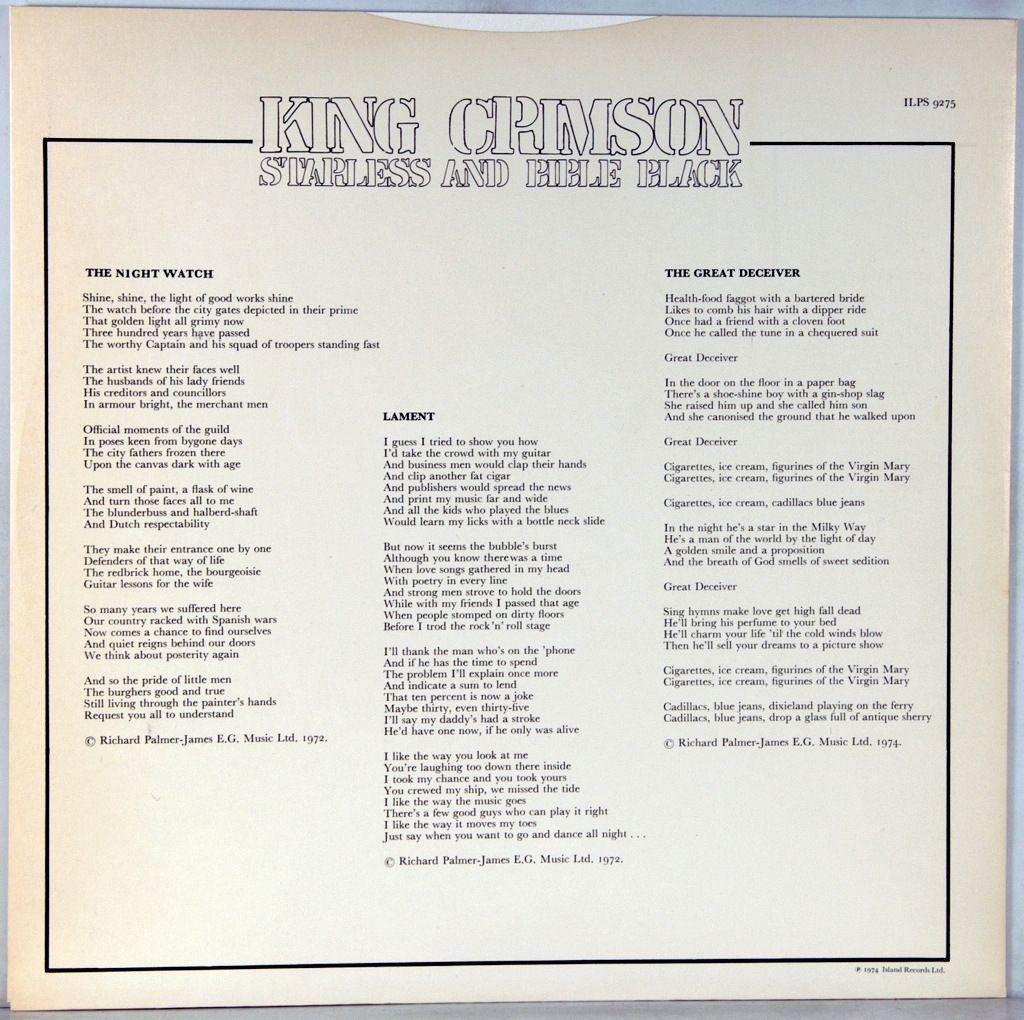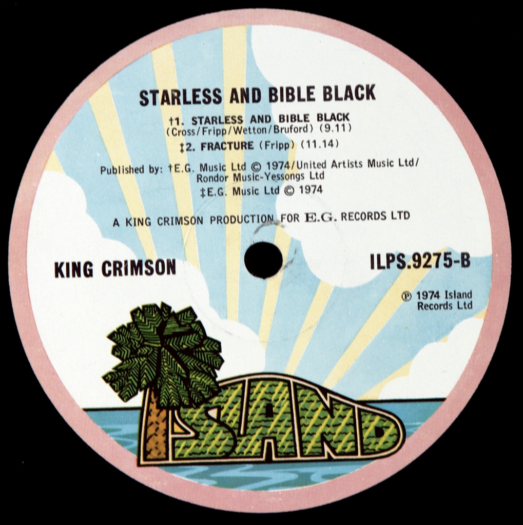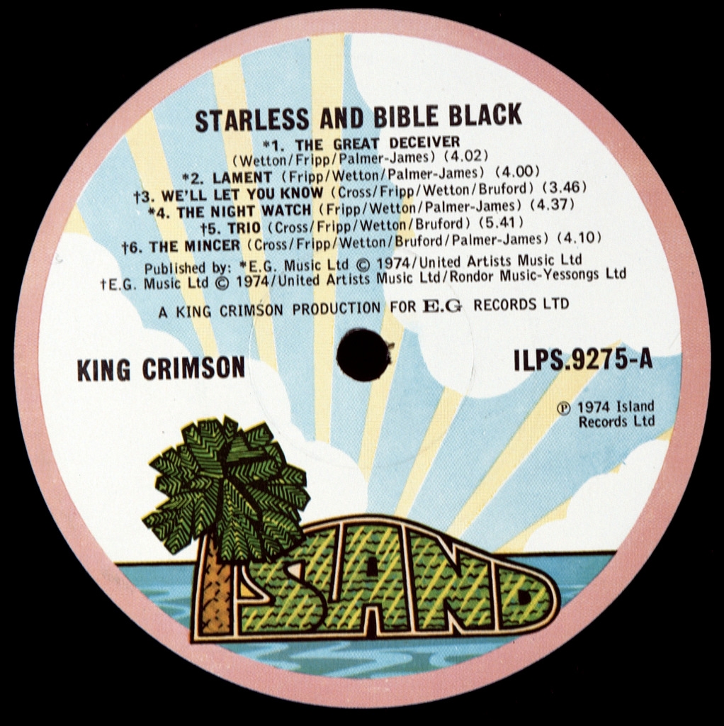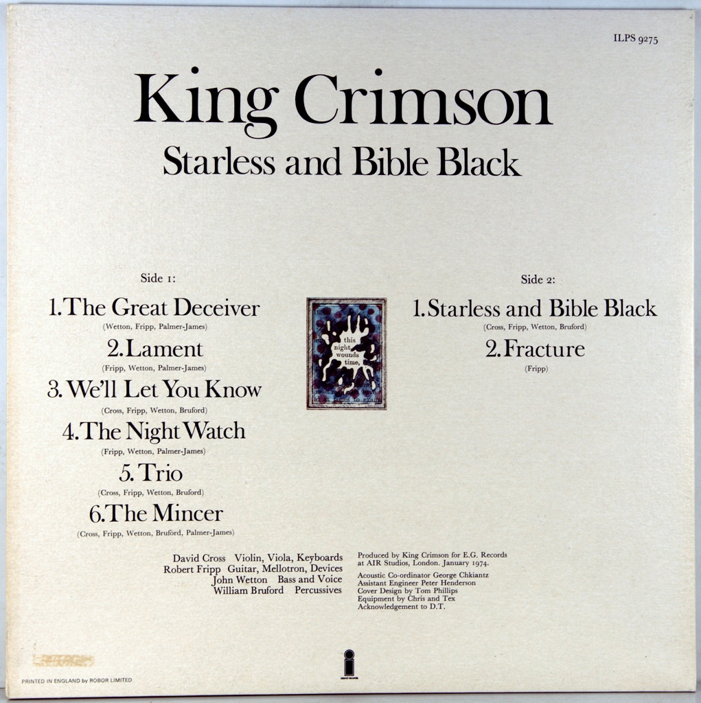 KING CRIMSON-STARLESS AND BIBLE BLACK-1974-ПЕРВЫЙ ПРЕСС UK-ISLAND-ILPS9275 Матрицы A-3U/B-3U SARC/SEAN+RAY. Стампера 2GL/1RM (Очень рано!) Очень редкий британский оригинал культовой прог группы. Starless and Bible Black — шестой студийный альбом английской прогрессив-рок-группы King Crimson, выпущенный в марте 1974 года лейблами Island Records в Великобритании и Atlantic Records в США. Большая часть альбома была записана вживую и смонтирована вместе со студийными записями и наложениями. Альбом включает несколько полностью импровизированных композиций.Rolling Stone назвал альбом «таким же потрясающим и мощным, как In the Court of the Crimson King», особенно высоко оценив игру Бруфорда и Кросса, а также разнообразие тембров и продолжительные инструментальные импровизации. Они заключили: «Фрипп наконец-то собрал группу своей мечты — надеюсь, она продержится вместе достаточно долго, чтобы продолжать выпускать такие же превосходные альбомы, как этот».