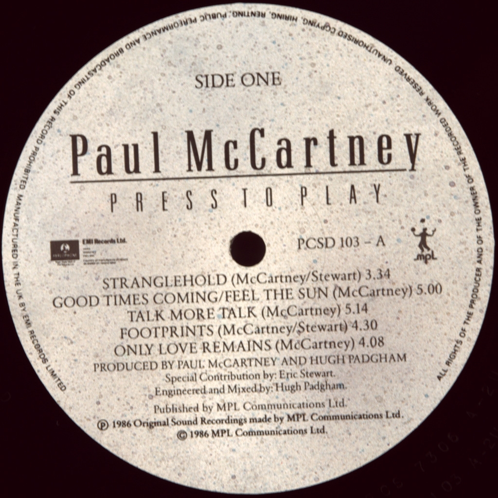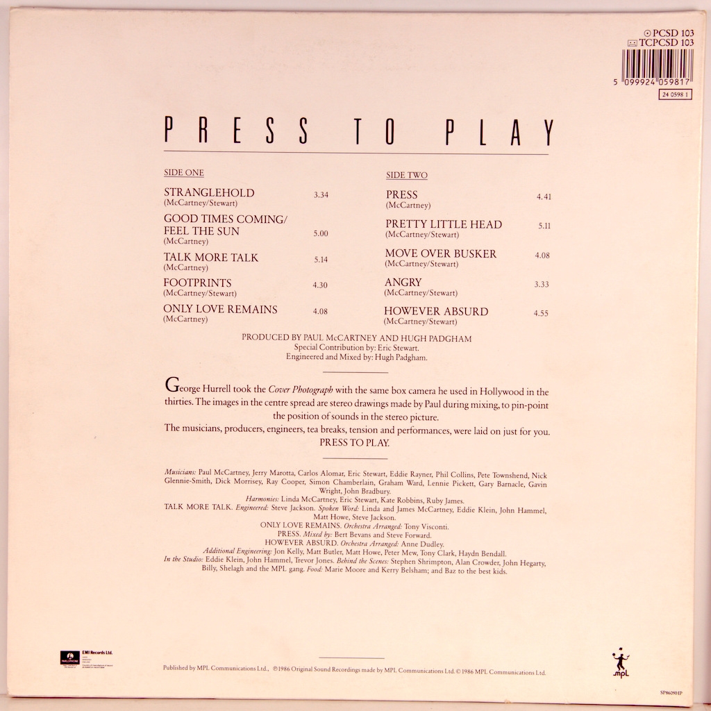 MCCARTNEY, PAUL-PRESS TO PLAY-1986-ПЕРВЫЙ ПРЕСС UK-PARLOPHONE -PCSD103. Редкий британский оригинал. Этот альбом считается у сэра Пола самым романтическим альбомом.Press to Play - шестой сольный студийный альбом Пола Маккартни, выпущенный 22 августа 1986 года. После всего изданного Маккартни за три последних года (после вышедшего в 1983 Pipes of Peace) альбом вновь содержал новые песни Маккартни. В работе над альбомом приняли участие такие известные музыканты, как гитарист Эрик Стюарт (экс-10cc; также стал соавтором 6 из 10 песен основного трек-листа альбома), гитарист Пит Таунсенд (The Who), барабанщик Фил Коллинз (Genesis), перкуссионист Рэй Купер. Сопродюсером альбома стал Хью Пэдхам (известный по своим работам с Genesis и Филом Коллинзом). Альбом имел большой успех в Британии -8 место альбом года, в США - 30 место Billboard 200, в разных странах Европы разместился в 20-ти строках чартов.