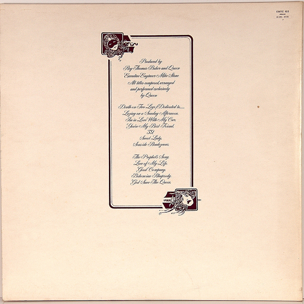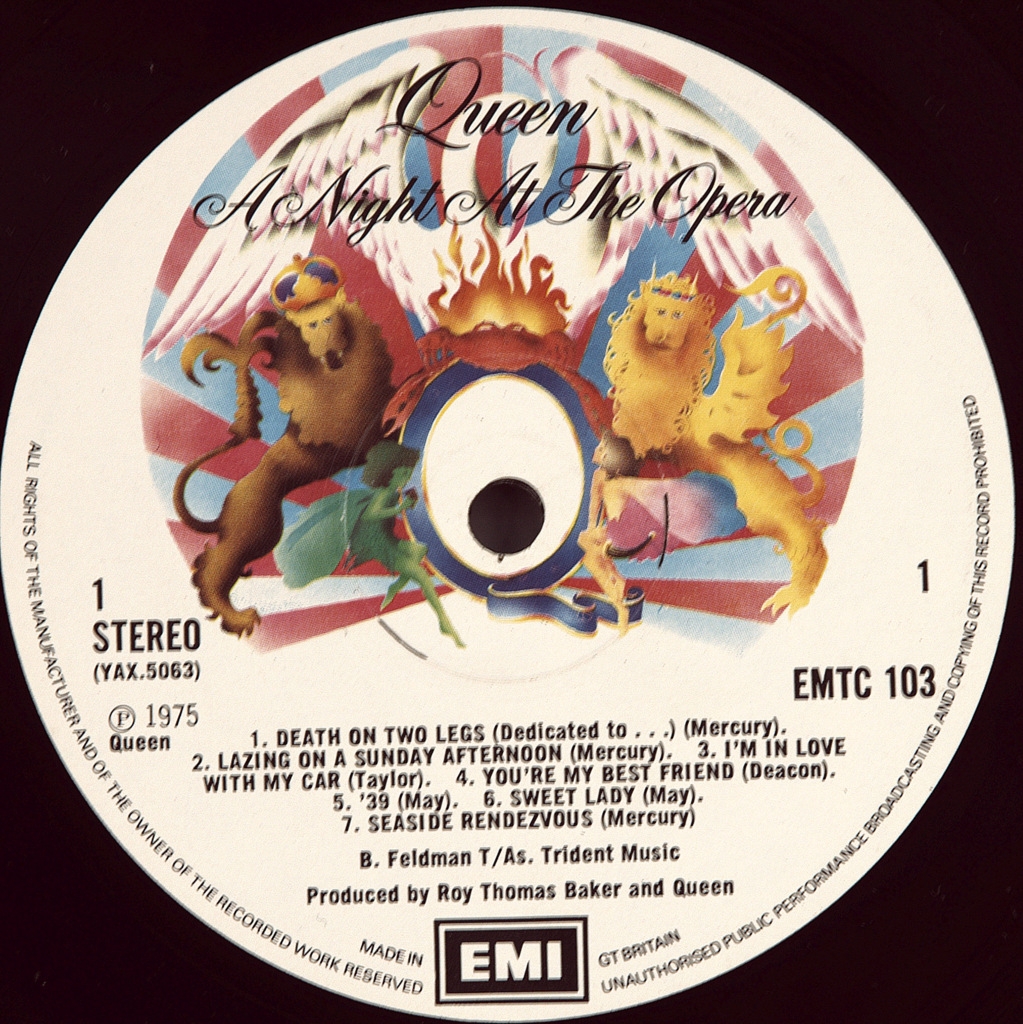 QUEEN-A NIGHT AT THE OPERA-1975-ПЕРВЫЙ ПРЕСС UK-EMI - EMTC103.Матрицы A-4/B-4.Редкий британский оригинал. A Night at the Opera — четвёртый студийный альбом рок-группы Queen, выпущенный 2 декабря 1975 года. Пластинка имела большой успех: её продажи достигли трёх миллионов, а в чартах Британии она держалась на первой позиции четыре непоследовательных недели. Название альбома — «Ночь в опере» — так же, как и последующего, взято из репертуара американских комиков 1930-х годов братьев Маркс, а именно из одноимённого фильма. На каждом концерте Queen обязательно исполнялось несколько песен из A Night at the Opera (при этом «Love of My Life» никогда не исполнялась в альбомной версии). Принято считать, что песня «Death on Two Legs» посвящена бывшему продюсеру группы. «Bohemian Rhapsody» принесла группе оглушительный успех и в 2000 году была признана в Британии «песней тысячелетия». Завершающая альбом «God Save the Queen» — аранжированный Брайаном Мэем гимн Великобритании; именно эта композиция неизменно завершала каждый концерт группы. Альбом занял 230 место в списке 500 величайших альбомов всех времён по версии журнала Rolling Stone 2003 года, и 128 место — в списке 2020 года.