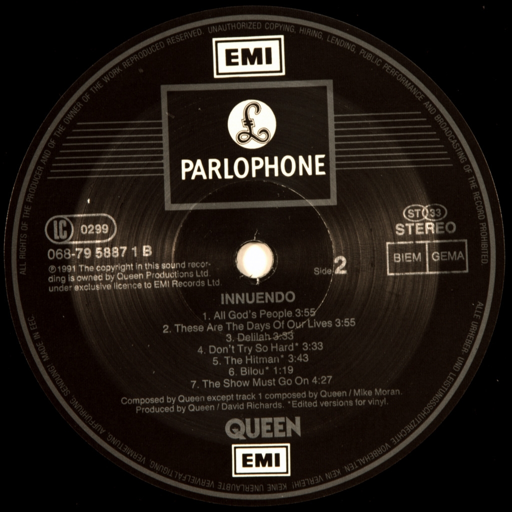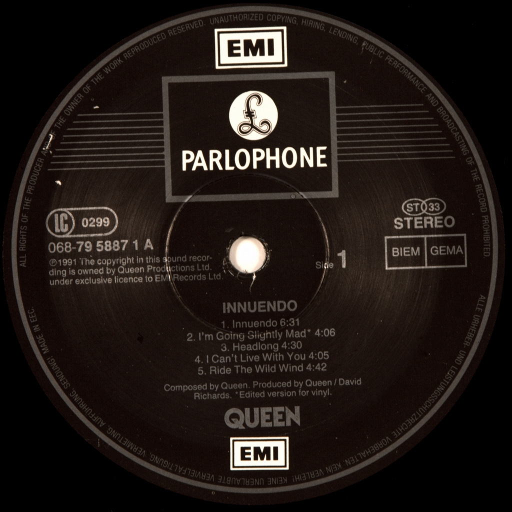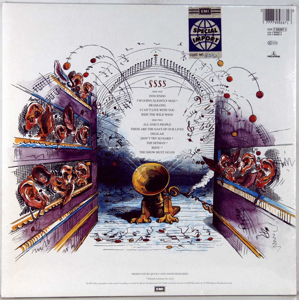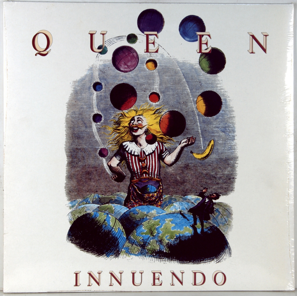 QUEEN-INNUENDO-1991-ПЕРВЫЙ ПРЕСС GERMANY-PARLOPHONE-058-7958871. Очень редкий германский оригинал культового альбома. Innuendo — четырнадцатый студийный альбом британской рок-группы «Queen». Выпущен 4 февраля 1991 года. Последний альбом «Queen», записанный и выпущенный при жизни Фредди Меркьюри. Название Innuendo содержит «косвенный намёк» на то, что группа в таком составе просуществует совсем недолго. Последние песни очень нелегко давались Фредди, который был уже тяжело болен. Тем не менее, альбом был закончен и прекрасно принят публикой. В его поддержку было снято несколько клипов, один из которых, «These Are The Days of Our Lives», стал последним видео с участием Меркьюри.Несмотря на смешанные оценки критики, новый альбом Queen достиг первой строчки в альбомных чартах Голландии, Швейцарии, Италии, Германии и родной Великобритании став дважды платиновым.