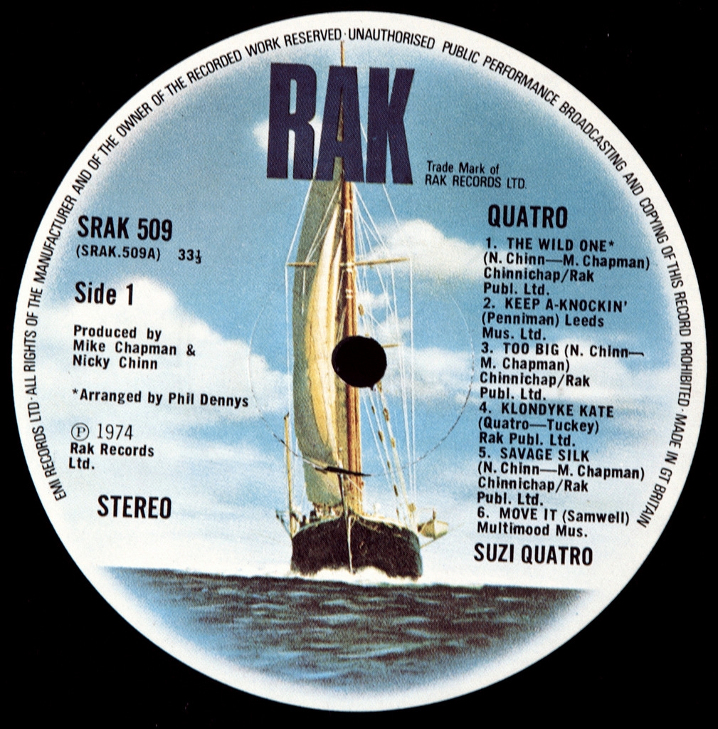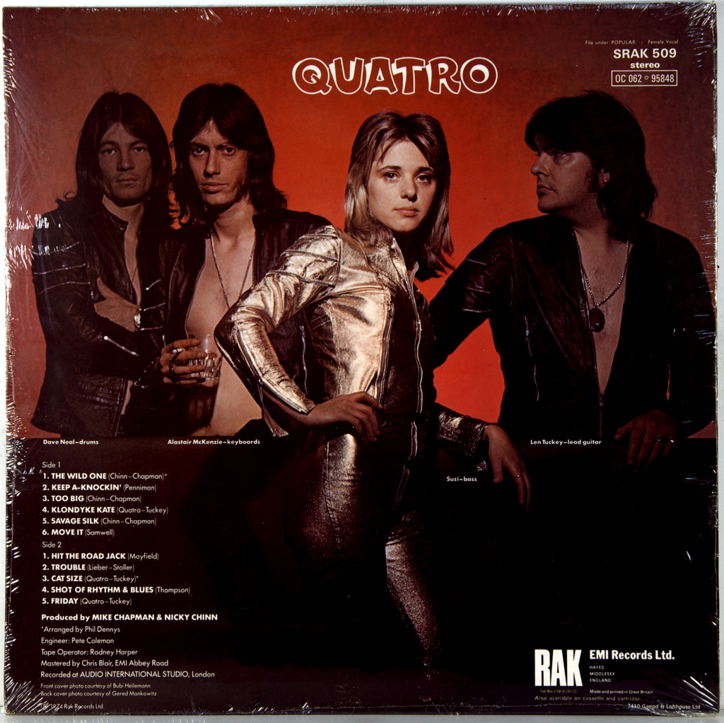 SUZI QUATRO-QUATRO-1974-ПЕРВЫЙ ПРЕСС UK-RAK-SRAK-509. матрицы А-2/В-1 Quatro — второй альбом Suzi Quatro, выпущенный в октябре 1974 года лейблом Rak Records под номером SRAK 509, за исключением США и Канады (где альбом был выпущен Bell Records), Японии (EMI Records) и нескольких европейских стран (Columbia Records). Альбом добился успеха в нескольких странах, возглавив австралийский чарт и продержавшись в нём шесть недель. Он также попал в чарты США, достигнув 150-го места. «Devil Gate Drive» стал настоящим хитом, заняв первое место в британских и австралийских чартах, став её вторым альбомом номер один в обеих странах. Синглы «The Wild One» и «Too Big» также добились коммерческого успеха: первый вошёл в топ-10 в Великобритании и Австралии, а второй — в топ-20 на тех же территориях.