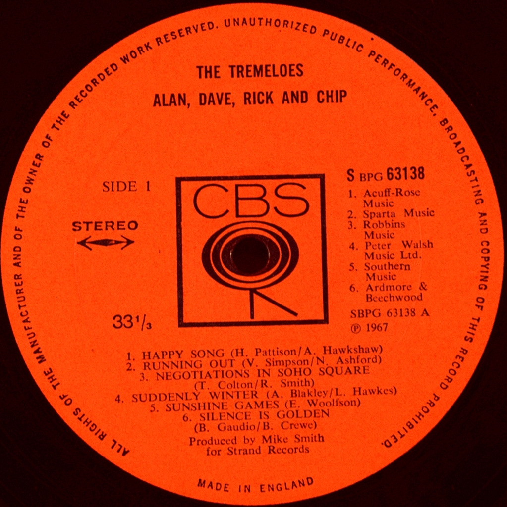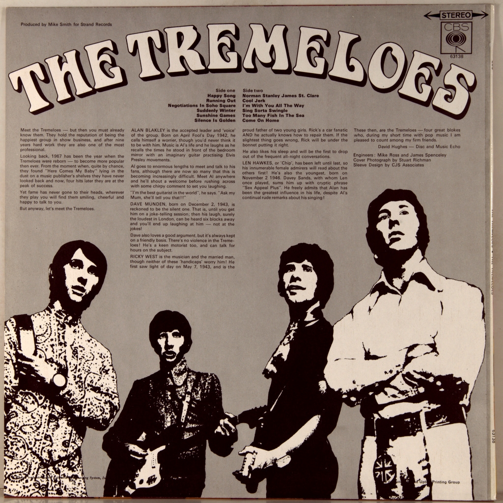 TREMELOES- ALAN, DAVE, RICK, AND CHIP-1967-ПЕРВЫЙ ПРЕСС UK-CBS-SBPG63138 Редкий оригинал культового альбома. The Tremeloes — британская поп-рок-группа, образовавшаяся в 1958 году в Лондоне, Англия (когда участники первого состава были ещё подростками) и спустя несколько лет ставшая важной частью британской поп-сцены. В общей сложности 14 синглов группы входили в первую двадцатку UK Singles Chart; два из них — «Here Comes My Baby» и «Silence Is Golden» — имели успех и в США.The Tremeloes были (согласно Allmusic) «одной из самых талантливых на британской поп-рок-сцене 1960-х годов, выпускала мастерски сработанные, запоминающиеся хит-синглы», в 1966—1970 годах имела большой успех по обе стороны Атлантики, но осталась недооценённой — во многом из-за того, что часто перепевала и заимствовала песенный материал, но главное — потому что «опоздала» к началу Британского вторжения. Вместе с тем, The Tremeloes — одна из самых долговечных британских групп 1960-х годов, которая спустя 50 лет после образования продолжает концертную деятельность.