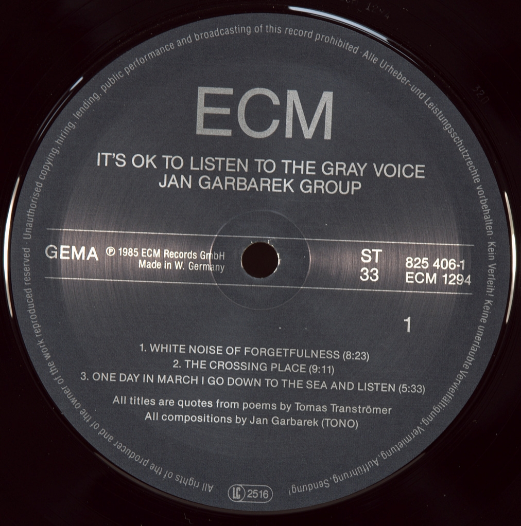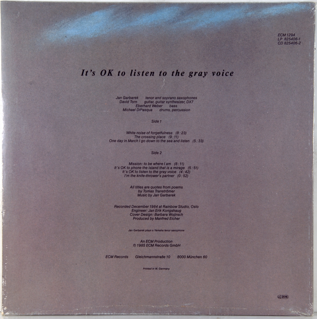 JAN GARBAREK GROUP-IT'S OK TO LISTEN TO THE GRAY VOICE -1985-ПЕРВЫЙ ПРЕСС GERMANY- ECM-ECM1294. Редкий оригинал культового джазмена. Альбом группы Яна Гарбарека, записанный в декабре 1984 года и выпущенный на ECM в сентябре следующего года. В состав квартета входят Дэвид Торн, Эберхард Вебер и Майкл Ди Паскуа. AllMusic поставил альбому четыре звезды, а критик Марк У. Б. Аллендер написал: Здесь Гарбарек приближается к крайностям своего стиля, снова выступая со своей группой. Все композиции на этом альбоме названы в честь цитат из стихотворений Томаса Транстрёмера, и хотя связь с этими стихотворениями в лучшем случае остаётся слабой, они добавляют провокационный элемент в сами композиции, которые требуют хотя бы какой-то программной интерпретации. Мультиинструменталист Дэвид Торн в первую очередь отвечает за более агрессивный характер этой пластинки. Его гитарные партии взрываются энергией и напряжением, предоставляя Гарбареку более широкое поле для игры, и, учитывая его склонность к чрезмерной сдержанности, это приятные моменты который украшают альбом.