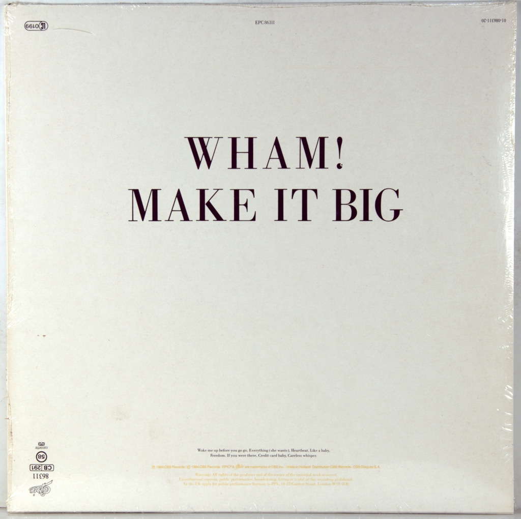 WHAM (GEORGE MICHAEL AND ANDREW RIDGELEY) - MAKE IT BIG -1984-ПЕРВЫЙ ПРЕСС UK/EU-HOLLAND -EPIC-EPC86311. Make It Big — второй студийный альбом английского поп-дуэта Wham!, выпущенный в 1984 году. По сравнению с их предыдущими работами, Wham! (Джордж Майкл и Эндрю Риджли) получили больше контроля над продюсированием альбома, и Майкл также был указан в качестве продюсера. Альбом имел коммерческий успех, заняв первое место в чартах США и Великобритании и породив четыре сингла, которые вошли в тройку лучших в США и Великобритании. Make It Big стал 4-кратным платиновым альбомом в США во время своего выхода и с тех пор стал 6-кратным платиновым альбомом в США
