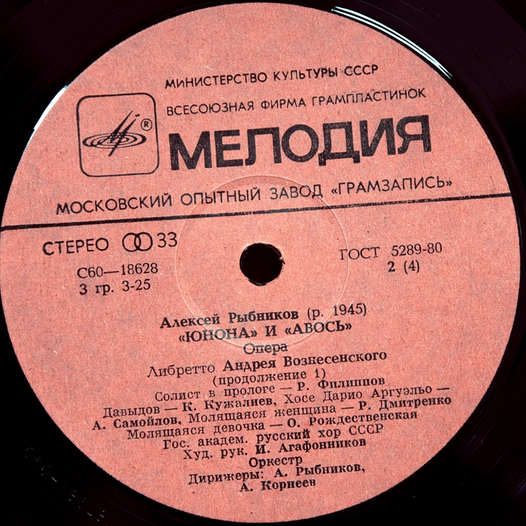 АЛЕКСЕЙ РЫБНИКОВ-РОК-ОПЕРА ЮНОНА И АВОСЬ-1980-ПЕРВЫЙ ПРЕСС RUSSIA-MELODIA-C60-18627. «„Юно́на“ и „Аво́сь“» — рок-опера Алексея Рыбникова (музыка) и Андрея Вознесенского (либретто). Премьера в постановке режиссёра Марка Захарова состоялась 9 июля 1981 года на сцене Московского театра имени Ленинского комсомола, где спектакль, ставший своеобразной визитной карточкой «Ленкома» Параллельно с работой над спектаклем в «Ленкоме» в 1980 году была записана аудиоверсия оперы с другими исполнителями. Первое публичное прослушивание записанного произведения состоялось 9 декабря 1980 в церкви Покрова в Филях (Москва). Однако из-за цензурных препон альбом из двух стереопластинок был выпущен фирмой «Мелодия» только в 1982 году (номер С60 18627-30 (2LP)).