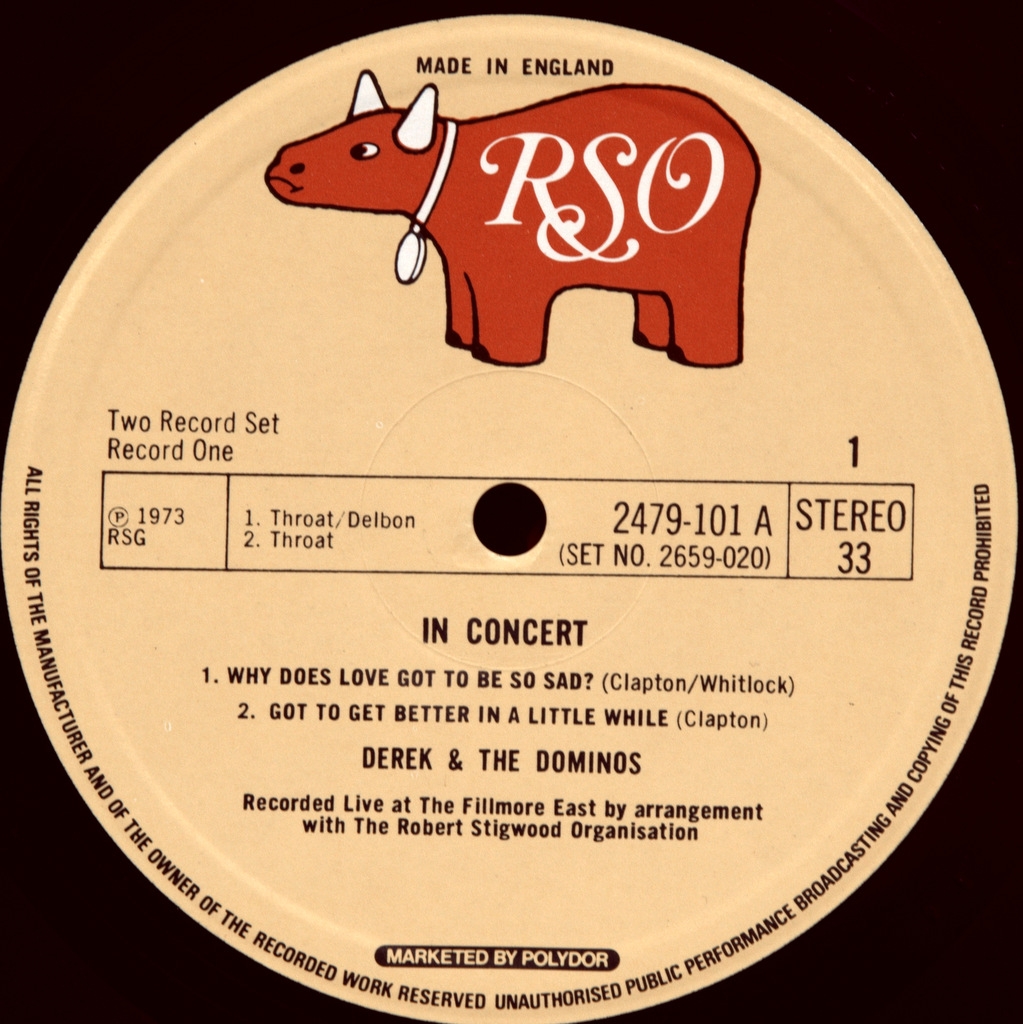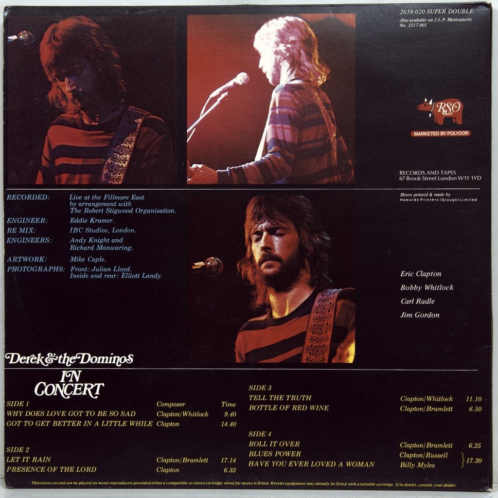 DEREK AND THE DOMINOS ( ERIC CLAPTON) -IN CONCERT (2LP'S) -1973 - ПЕРВЫЙ ПРЕСС UK -RSO- 2659020 матрицы disc one-A1/B1 disc two- A2/B2. Очень редкий британский оригинал культового концерта Клэптона. n Concert — двойной концертный альбом, записанный Derek and the Dominos в октябре 1970 года в Fillmore East и выпущенный в январе 1973 года. Шесть из девяти треков альбома позже были включены в альбом 1994 года Live at the Fillmore. Три песни, которые не вошли в него, — это «Why Does Love Got to Be So Sad», «Let It Rain» и «Tell the Truth». Live at the Fillmore также включает эти песни, хотя они из других наборов, а не из тех, что представлены здесь. Альбом получил золотой статус в США.