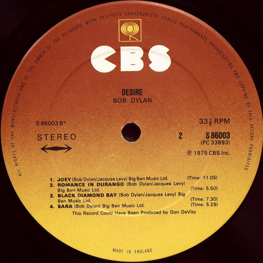 DYLAN, BOB-DESIRE-1976-ПЕРВЫЙ ПРЕСС UK-CBS-S86003. Редкий британский оригинал в топ состоянии. Desire — семнадцатый студийный альбом американского автора-исполнителя Боба Дилана. Выпущен в январе 1976 года на лейбле Columbia Records. Наибольшую известность получила открывающая альбом песня «Hurricane». Она является протестом против осуждения боксёра Рубина Картера по прозвищу «Hurricane», обвиняемого в тройном убийстве. Альбом получил хорошие оценки и был на первой позиции в Billboard Pop Albums chart в течение пяти недель, став одним из самых продаваемых альбомов Дилана (и получив статус дважды платинового), а также поднялся до третьей позиции в Великобритании. Альбом занял первую позицию списке альбомов года журнала New Musical Express.