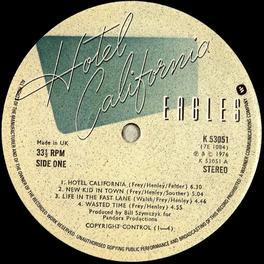 EAGLES-HOTEL CALIFORNIA-1976-ПЕРВЫЙ ПРЕСС UK-ASYLUM - K53051 . Матрицы A-1/B-1. Редкий британский оригинал. В 2001 году альбом Hotel California стал 15-м в списке величайших альбомов всех времён, версия VH1. В 2002 году альбом занял 11 строку «100 лучших рок-альбомов всех времён» по версии журнала Classic Rock. Композиции с альбома- «New Kid in Town» и «Hotel California» -возглавили американский чарт продаж (Billboard Hot 100), причём последняя была также удостоена «Грэмми».