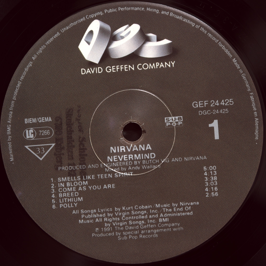 NIRVANA-NEVERMIND-1991-ПЕРВЫЙ ПРЕСС UK/EU-GERMANY-DGC- GEF24425 Очень редкий оригинал основателей гранжа.Nevermind — второй и самый коммерчески успешный альбом американской гранж-группы Nirvana. Был выпущен 24 сентября 1991 года на лейбле DGC Records, продюсером записи выступил Бутч Виг. В январе 1992 года альбом занял первое место в чарте журнала Billboard, опередив Майкла Джексона с диском Dangerous, что расценивается как знаковое событие для андеграундной музыки. Nevermind разошёлся тиражом более 30 миллионов копий по всему миру, американская ассоциация звукозаписывающих компаний сертифицировала его как «бриллиантовый». После выхода Nevermind альтернативный рок стал считаться частью мейнстрима[7], впоследствии критики признавали его одним из лучших альбомов всех времён, включая такие издания, как Rolling Stone, NME и Time