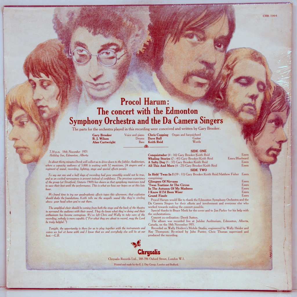 PROCOL HARUM-LIVE IN CONCERT WITH EDMONTON SYM. ORCH.-1972-ПЕРВЫЙ ПРЕСС UK-CHRYSALIS-CHR1004. Матрицы A-2U/B-2U Стампкра 2T/1T (Мечта!). Редкий британский оригинал. Концерт с Симфоническим оркестром Эдмонтона английской группы Procol Harum был выпущен в 1972 году; он был записан в Юбилейном зале Северной Альберты в Эдмонтоне, Альберта, Канада, 18 ноября 1971 года. Альбом достиг № 7 в Канаде и был очень успешным на Billboard топ-200, достигнув пика на 5. месте. Это самый продаваемый альбом группы, сертифицирован золотом RIAA. Живая версия песни «Conquistador» из этого альбома стала хитом как на поп-, так и на прогрессивном радио в США и вошла в топ-20 Billboard Hot 100, а также в топ-10 в нескольких других странах.