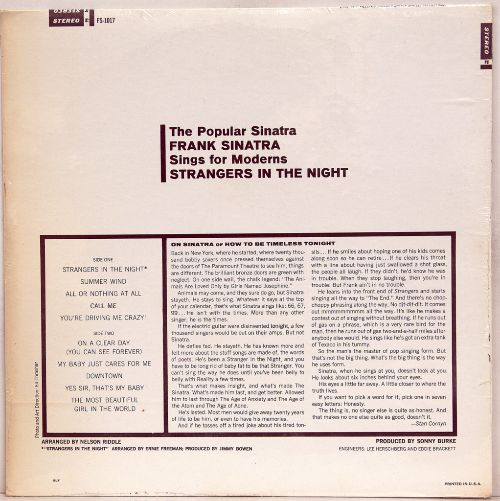 SINATRA, FRANK - STRANGERS IN THE NIGHT-1966-ВТОРОЙ ПРЕСС (STEREO) USA-REPRISE- FS1017. Редкий американский оригинал второго издания культового альбома. На церемонии вручения премии «Грэмми» 1967 года Sinatra получил две премии «Грэмми» за свои усилия в этом альбоме, включая « Рекорд года» за заглавный трек, а также за лучшее мужское вокальное исполнение за ту же песню. (В том же году он получил еще одну премию «Грэмми» - « Альбом года для мужчины и его музыки» ). Аранжировка Ernie Freeman к заглавному треку принесла ему премию Грэмми за лучшую аранжировку в сопровождении вокалиста или инструменталиста Это последний альбом, который Sinatra исполнил с давним аранжировщиком / дирижером Nelson Riddle и его оркестром. "Strangers in the Night" стал платиновым за миллион проданных копий в США.