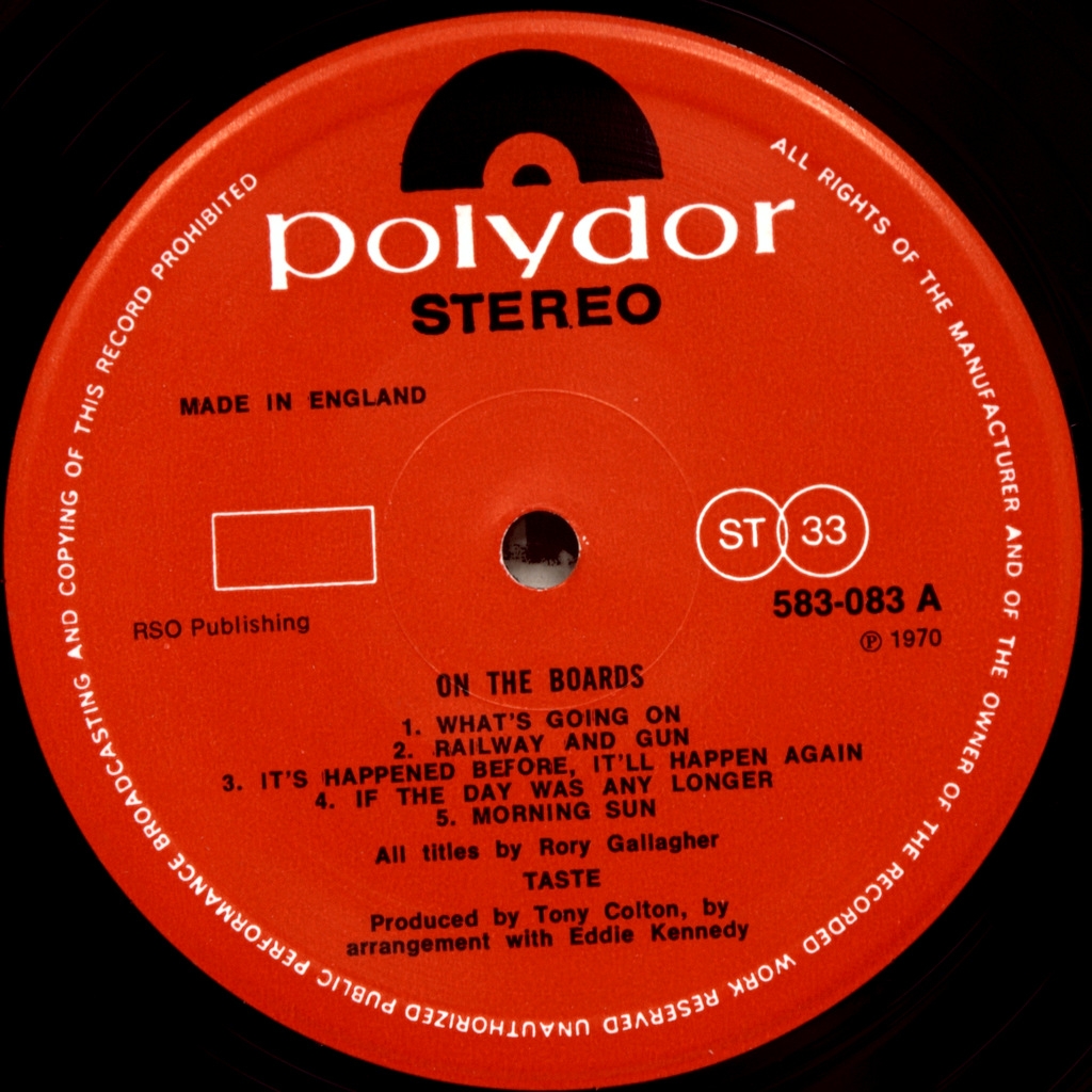 TASTE - ON THE BOARDS -1970- ВТОРОЙ ПРЕСС 1971 UK-POLYDOR-583083. Матрицы A-1/B-1 . Редкий британский оригинал блюзовой группы TASTE.On the Boards — второй альбом ирландской рок-группы Taste, выпущенный 9 января 1970 года после записи, которая состоялась 13 месяцами ранее, в декабре 1968 года. Это их последний студийный альбом, который принёс Рори Галлахеру известность, заняв 18-е место в британском чарте альбомов.[4] Рецензенты высоко оценили его разнообразие и точность ансамблевой игры, а также отметили джазовые интонации в игре Галлахера на гитаре и его неподражаемый вокал. Лестер Бэнгс назвал его «впечатляющим... прогрессивным блюзом».