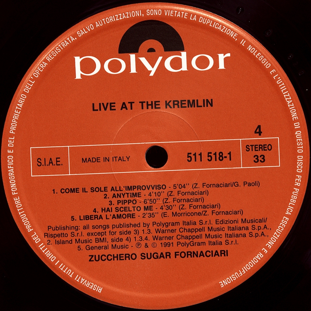 ZUCCHERO-LIVE AT THE KREMLIN (2LP'S)-1991-ПЕРВЫЙ ПРЕСС ITALY-POLYDOR-511519-1.. Редкий оригинал итальянского романтика блюз-рока. Zucchero — Live At The Kremlin — первый концертный альбом итальянского певца Зуккеро Форнациари, выпущенный 4 ноября 1991 года лейблом Polydor. После выхода его одноимённого альбома «Oro, Incenso e Beer», он отправляется в Москву кульминацией которого стал двойной концерт в Московском Кремле, в Конгресс-холле. Второй концерт 9 декабря 1990 года транслировался в прямом эфире по всему миру на Rai Due. Концерт был записан и смикширован Маурицио Магги и выпущен в полном объёме без каких-либо изменений или технической коррекции. Как он написал в своей автобиографии под названием «Звук воскресенья — роман моей жизни», Цукеро давал концерт, испытывая сильную паническую атаку. Тем не менее выступление, первое для западного артиста в Советском Союзе после падения Берлинской стены, прошло успешно. Среди гостей на сцене были Рэнди Кроуфорд, который спел дуэтом с Цукеро «Come Il Sole» на английском языке, и Джон Леннон, которому была посвящена песня «Imagine», посвящённая знаменитому музыканту в десятую годовщину его смерти. Затем появляется Тони Чайлдс, с которым Зуккеро исполняет «Many Rivers To Cross», и Юрий Каспарян, гитарист легендарной советской рок-группы «Кино», который принял участие в концерте со своей гитарой вместе с Андреа Брайдо. Наконец, стоит отметить вклад певицы Лизы Хант, которая сопровождала песни своим проникновенным вокалом и особенно выделилась в исполнении Madre Dolcissima. Во время концерта, как и полагалось по советскому обычаю, не было аплодисментов, но в конце зрители аплодировали стоя в течение 20 минут.