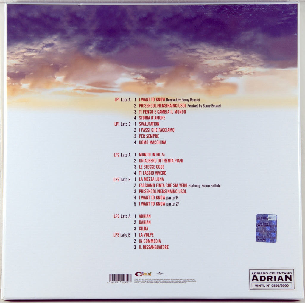 CELENTANO, ADRIANO-ADRIAN (3 LP'S) -2019-ПЕРВЫЙ ПРЕСС (LIM ED. 856/3000) ITALY-CLAN-602577424595. Редкий итальянский оригинал культового альбома. Саундтрек к анимационному фильму "Adrian" содержит музыку, написанную Николой Пиовани и несколько наиболее важных музыкальных произведений из репертуара Адриано Челентано. Проект также включает серию важных хитов и ремикс от Бенни Беннасси на некоторые исторические песни Адриано Челентано.