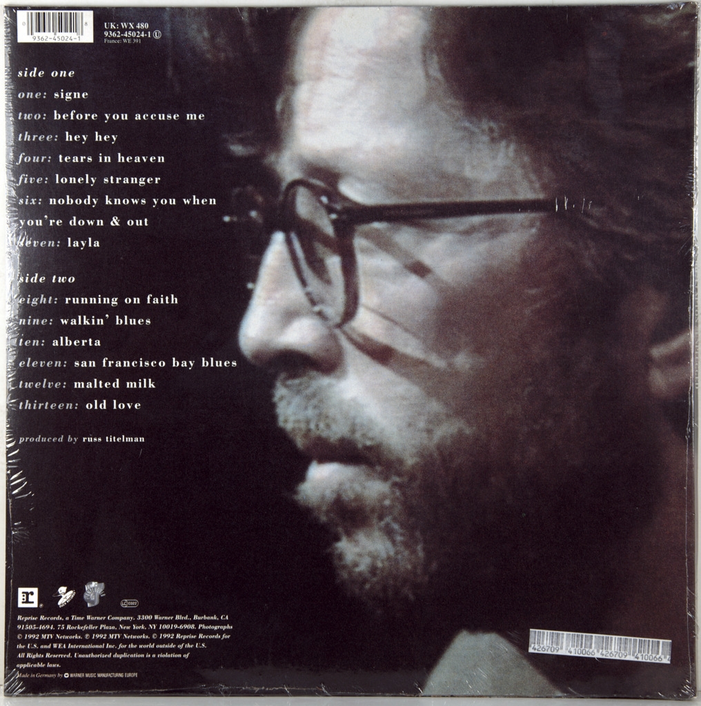 CLAPTON, ERIC-UNPLUGGED-1992-ПЕРВЫЙ ПРЕСС UK/EU GERMANY-REPRISE номер 9362-45024-1 Очень редкий оригинал.Один из самых знаменитых альбомов блюз-рок музыканта ERIC CLAPTON, изданный в 1992 году. Был записан в Bray Studios в Виндзоре, Англия 16 января 1992 года. Входит в серию концертных альбомов, записанных в эфире MTV Unplugged. Альбом включает в себя 14 любимых песен Клэптона.В 2000 году Unplugged занял 71 место в списке «100 лучших британских альбомов» по версии журнала Q. В 2011 году — 9 место в списке «10 лучших гитарных альбомов 1992 года» по версии Guitar World.