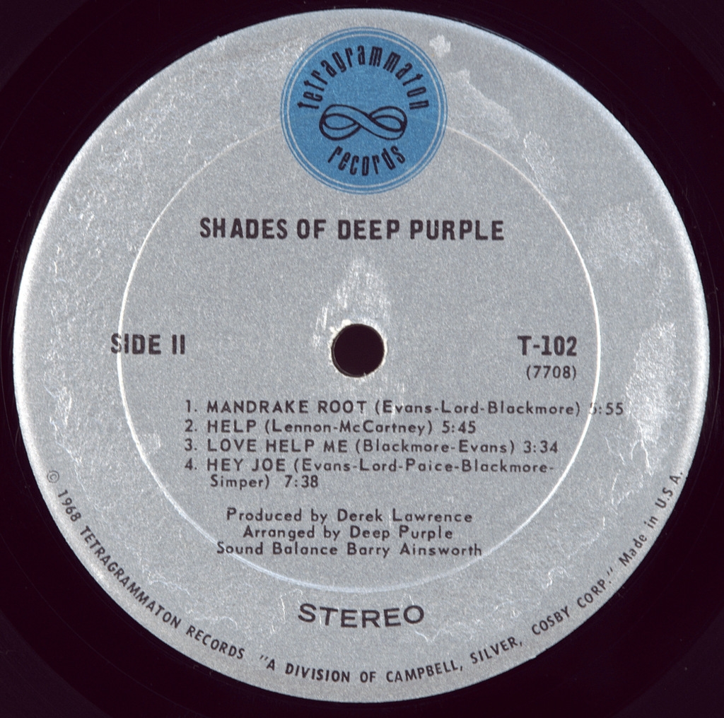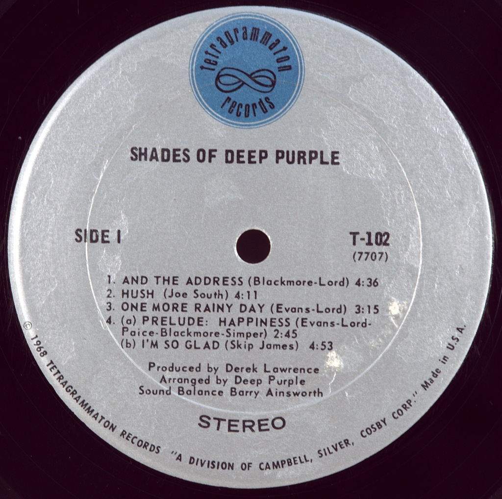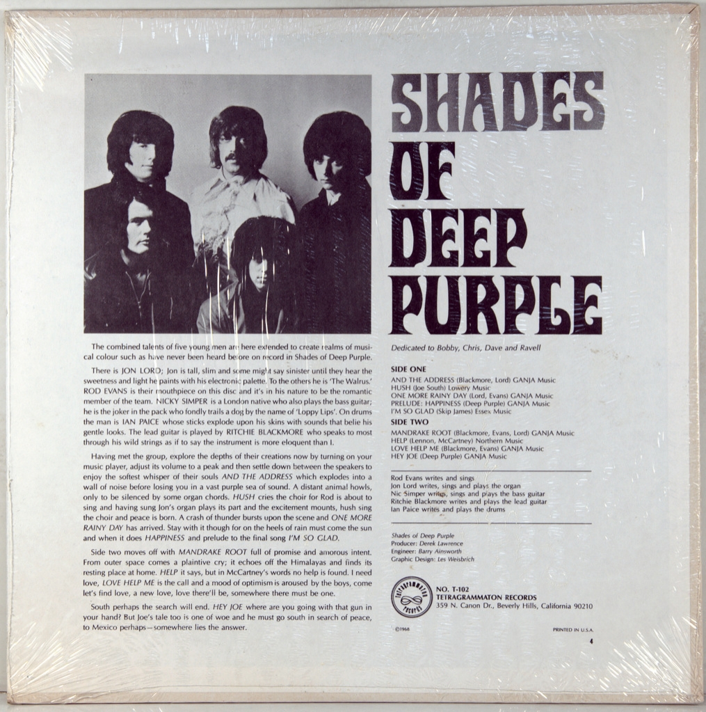DEEP PURPLE-SHADES OF DEEP PURPLE-1968-ПЕРВЫЙ ПРЕСС USA-TETRAGRAMMATON- T-102, Shades of Deep Purple — дебютный альбом английской рок-группы Deep Purple, выпущенный в июле 1968 года на лейбле Tetragrammaton в США и в сентябре 1968 года на лейбле Parlophone в Великобритании. Группа, изначально называвшаяся Roundabout, была идеей бывшего барабанщика SearchersКриса Кёртиса, который пригласил в группу Джона Лорда и Ричи Блэкмора, прежде чем покинуть проект. В марте 1968 года состав группы пополнился вокалистом и фронтменом Родом Эвансом, а также басистом Ником Симпером и барабанщиком Иэном Пейсом. После двух месяцев репетиций альбом Shades of Deep Purple был записан всего за три дня в мае 1968 года. Он содержит четыре оригинальные песни и четыре кавер-версии, тщательно аранжированные с добавлением классических интерлюдий, чтобы звучание было более психоделическим. Стилистически музыка близка к психоделическому року и прогрессивному року — двум жанрам, аудитория которых постоянно росла в конце 1960-х. Альбом не получил широкого признания в Великобритании, где было продано очень мало копий и он не попал в чарты. С другой стороны, в США он имел успех, а сингл "Hush", энергичный рок-трек, написанный Джо Саутом и изначально записанный Билли Джо Роялом, стал очень популярным в то время и занял 4-е место в американском чарте Billboard Hot 100