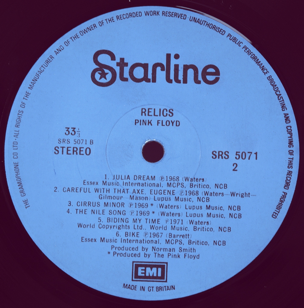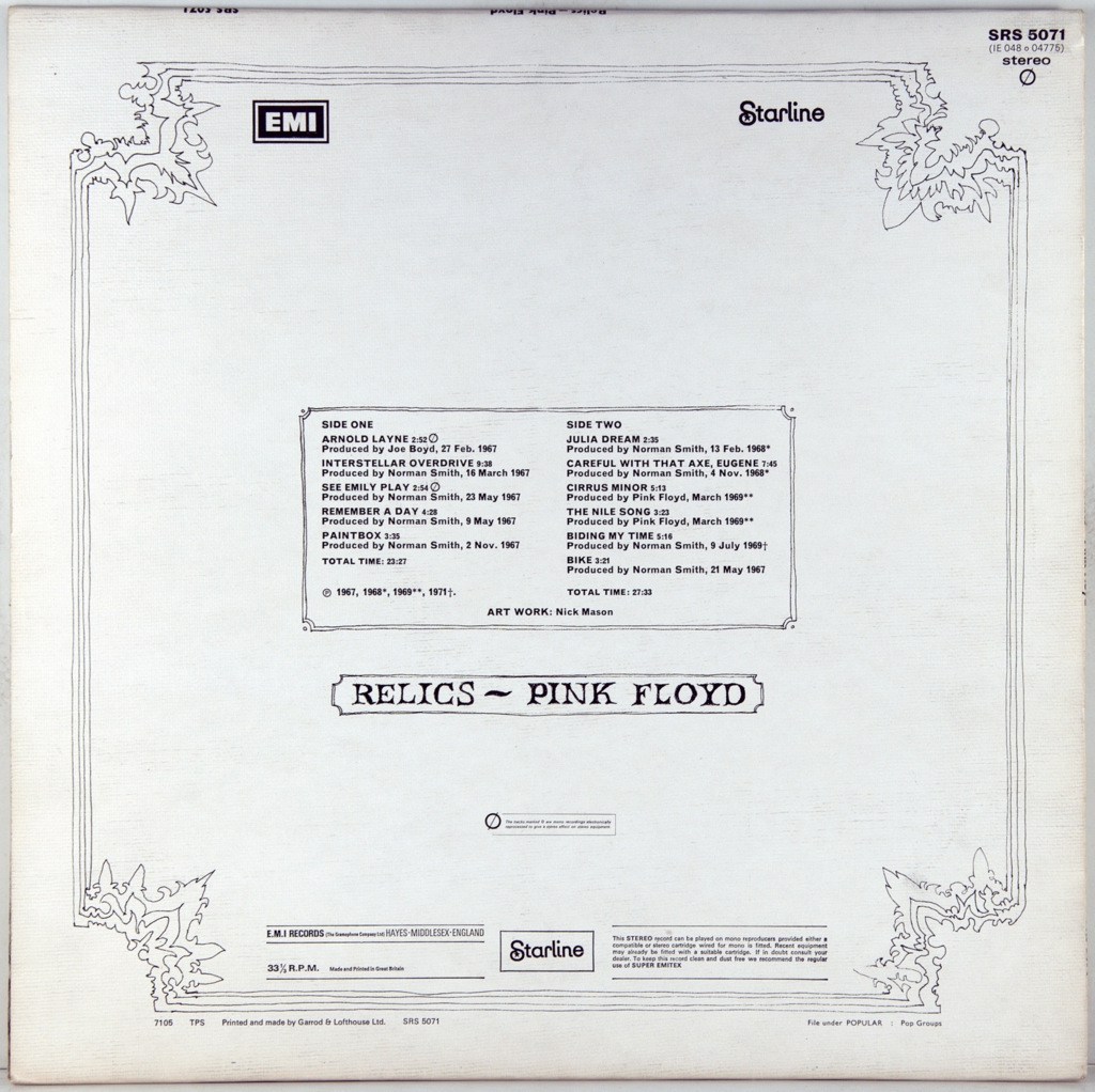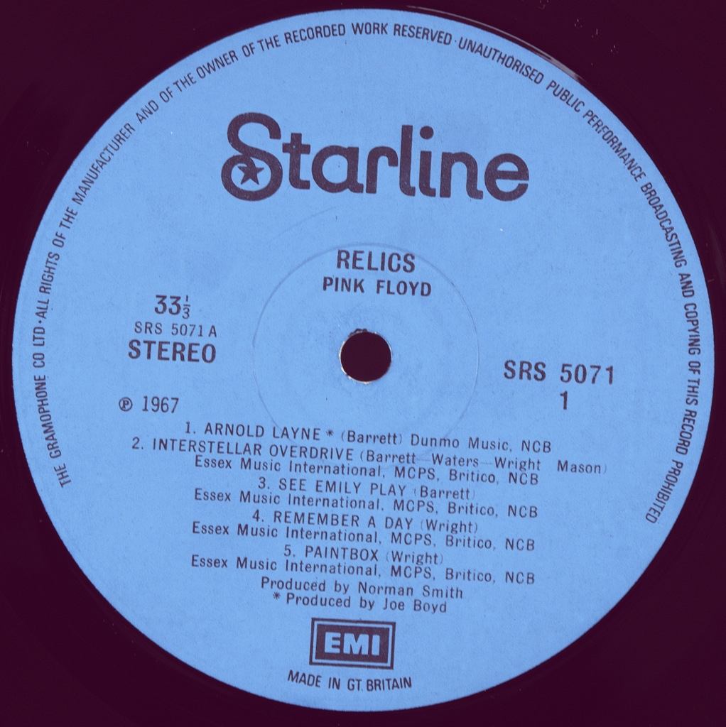 PINK FLOYD-RELICS-1971-ПЕРВЫЙ ПРЕСС UK-EMI-SRS5071. Матрицы A-1/B-2. Редкий оригинал культового альбома. Relics -сборник 1971 года английской рок-группы Pink Floyd. Альбом был выпущен в Великобритании 14 мая 1971 года, а в США — на следующий день. Первоначально сборник был выпущен лейблом Starline, а затем переиздан лейблом Music for Pleasure в Великобритании, в то время как Harvest и Capitol распространяли альбом в США. Обновлённая версия компакт-диска была выпущена в 1996 году с другой обложкой, на которой была изображена трёхмерная модель, созданная на основе эскиза, нарисованного барабанщиком Ником Мэйсоном для первоначального выпуска альбома.