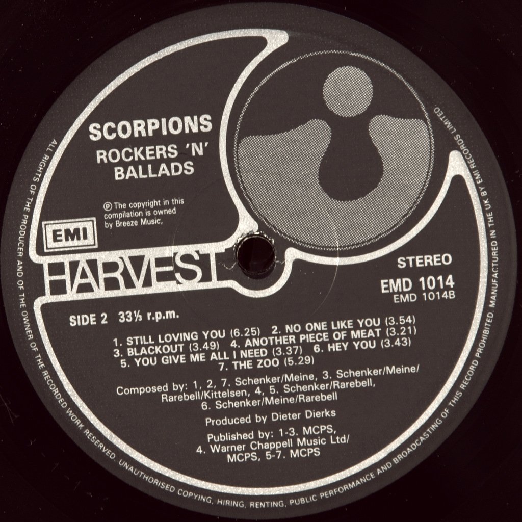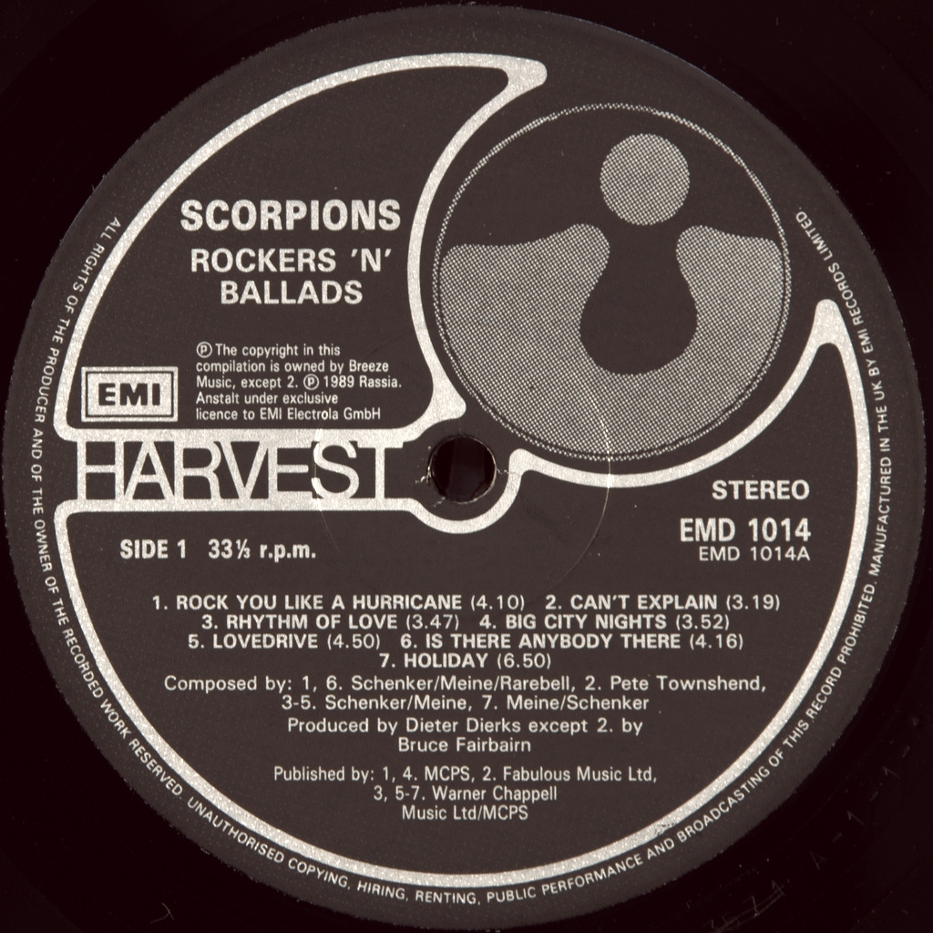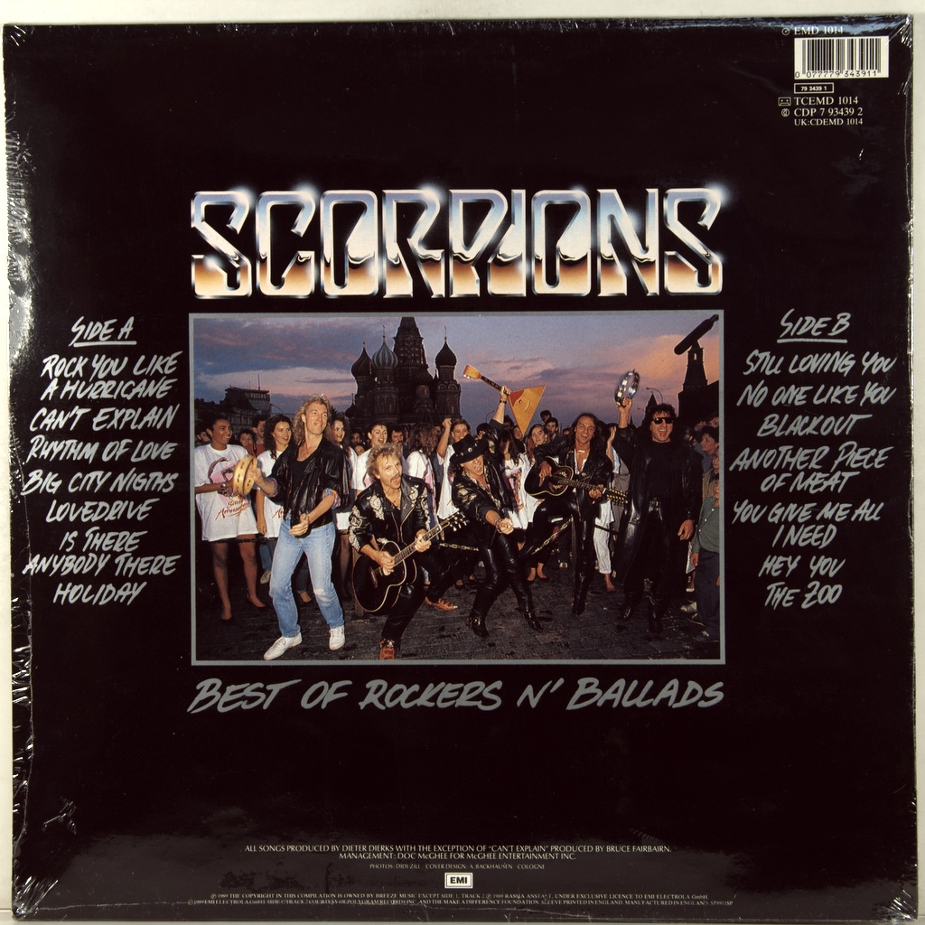 SCORPIONS-BEST OF ROCKERS N' BALLADS-1989-ПЕРВЫЙ ПРЕСС UK-HARVEST-EMD1014. Редкий британский оригинал альбома куда вошли лучшие балладные и роковые композиции с альбомов 1978-1988 годов. Scorpions - немецкая англоязычная рок-группа, созданная в 1965 в Ганновере. Для стиля группы характерны как классический хард-рок, так и лирические гитарные баллады.