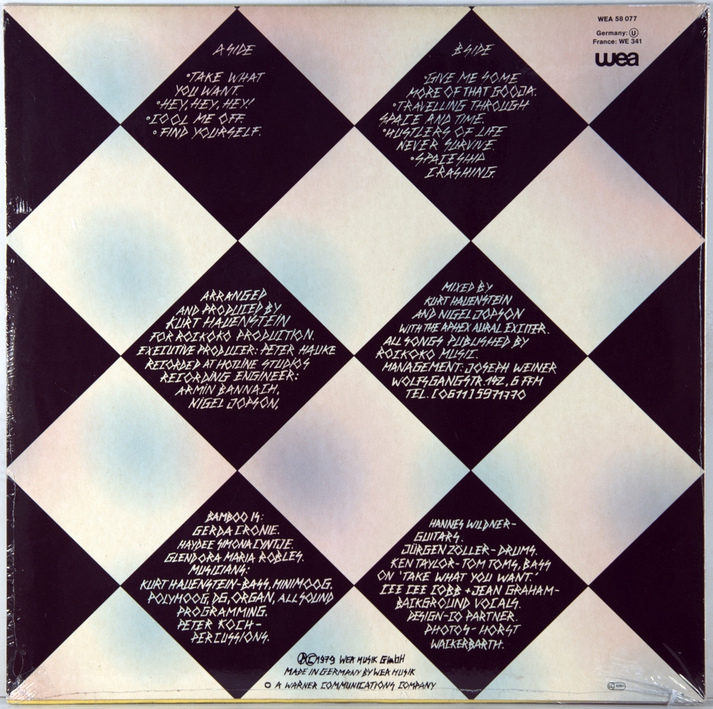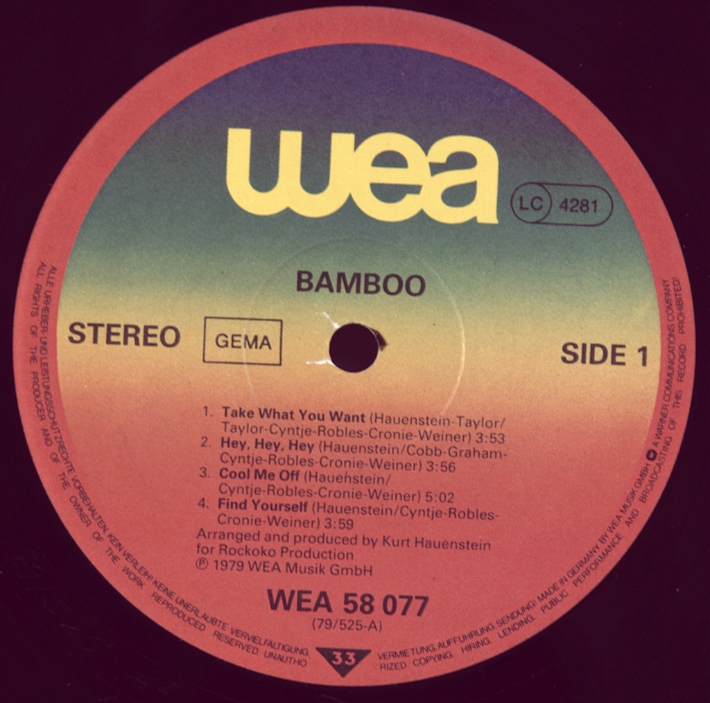 BAMBOO (SUPERMAX) -BAMBOO-1979-ПЕРВЫЙ ПРЕСС GERMANY-WEA-WEA58077. Мега редкий оригинал культового альбома проекта KURT HAUENSTEIN (SUPERMAX). «BAMBOO» – сайд-проект Курта Хауэнштайна - лидера и создателя группы "Supermax" и вокалисток из Суринама. В этом проекте Хауэнштайн отказался от мужского (собственного) вокала в пользу женского. Видна его концепция «сделать нечто поуниверсальней». Проект обустроен всецело по супермаксовым рецептам. Курт сочинил, аранжировал, да и сыграл в основном всё сам (бас, синтезаторы и прочие клавишные). Помимо трёх вокалисток ему помогают два перкуссиониста и ударник, плюс ещё двое значатся на подпевках. Результат – синтезаторный диско-фанк, однако музыкальная эстетика «идеологически» ближе к диско (в густо-синтезаторной его версии) с важным отличием от массового пошиба, ибо грув ударных поизысканней, бас, естественно, тоже не прост. Классический симбиоз диско с реггей также в наличии. В итоге: восемь вещей, а альбом идёт ровно и уверенно. Может быть «функциональной музыкой», как для танцевальных нужд, так и, как ни странно, для спокойного фонового звучания. Для вдумчивого прослушивания тоже сгодится – везде много интересного, в деталях и их сочетаниях.