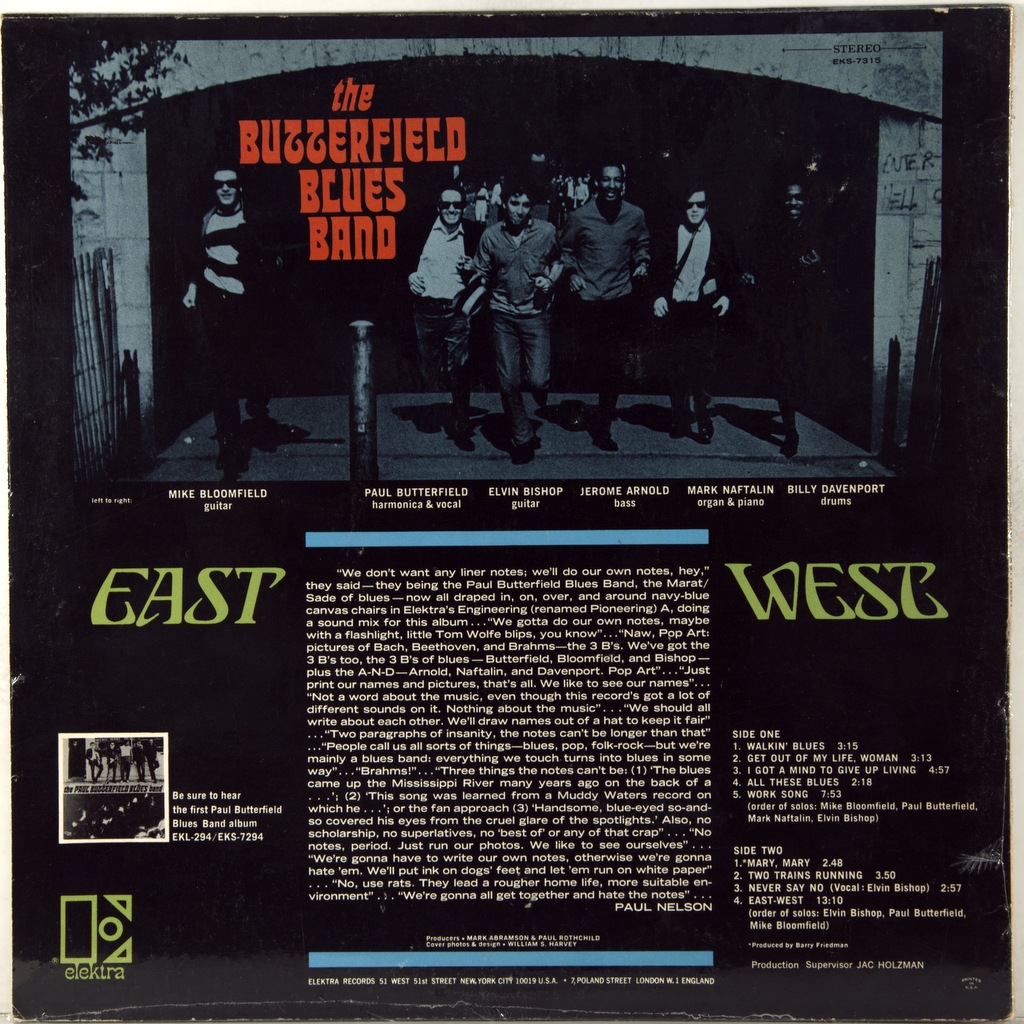 BUTTERFIELD BLUES BAND-EAST-WEST-1966-ПЕРВЫЙ ПРЕСС (STEREO) UK-ELEKTRA-EKS-7315. Очень редкий стерео оригинал культового альбома. East-West — второй альбом американской блюз-рок группы The Butterfield Blues Band, выпущенный в 1966 году на лейбле Elektra Он занял 65-е место в чарте поп-альбомов Billboard и считается очень влиятельным среди историков рок- и блюз-музыки.