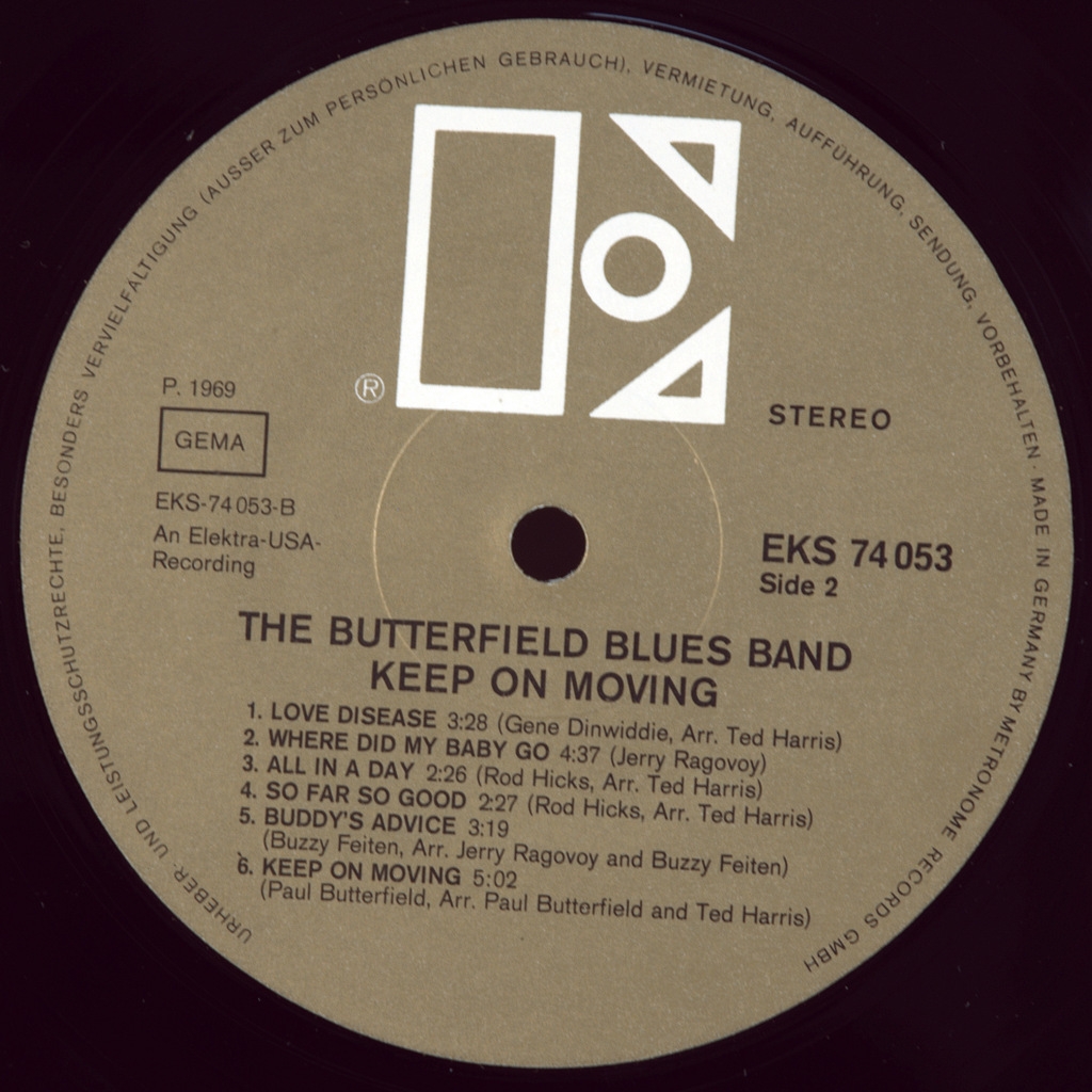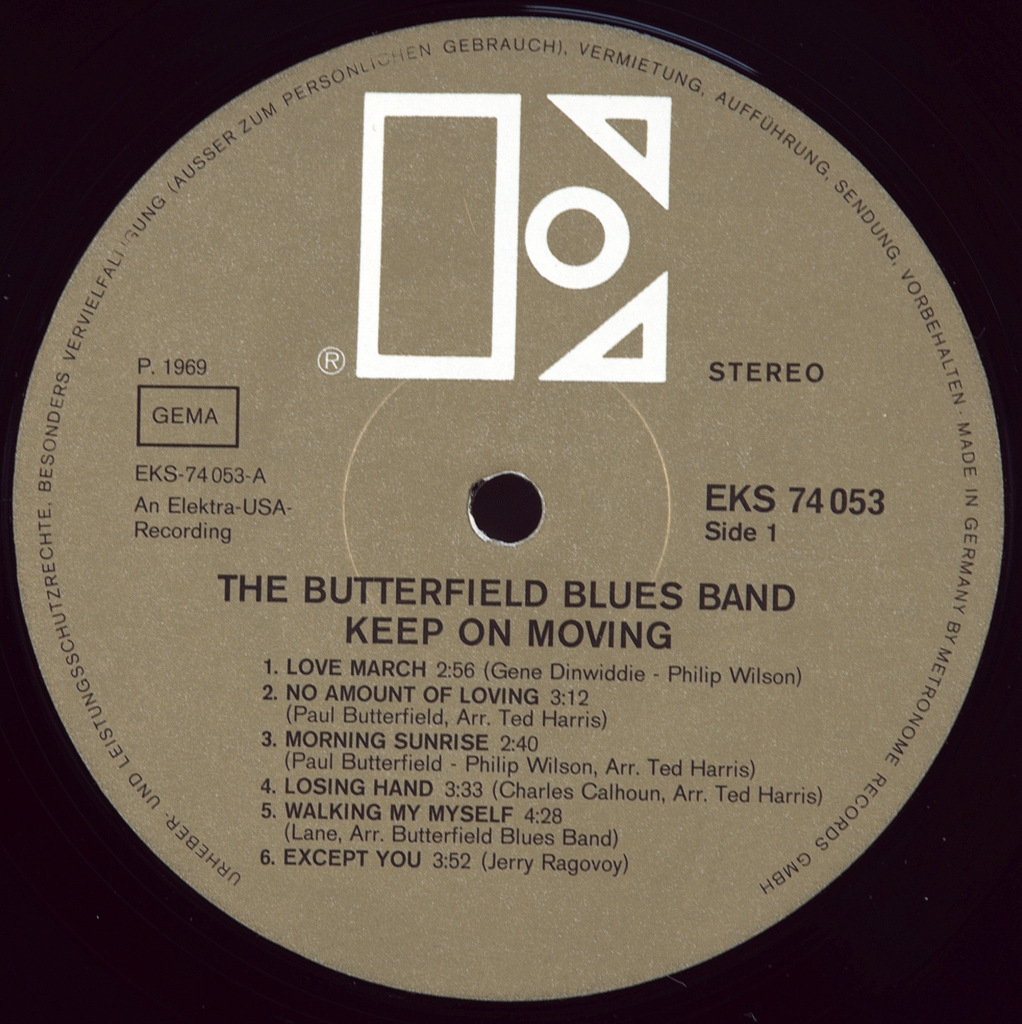 BUTTERFIELD BLUES BAND-KEEP ON MOVING-1969-ПЕРВЫЙ ПРЕСС GERMANY-ELEKTRA-EKS74053. Матрицы A-2 CP RL /B-CP RL . Матрица использовалась американская и резал ее Роберт Людвиг. Редкий германский оригинал блюзового мэтра. Keep On Moving-это пятый альбом группы The Butterfield Blues, который был выпущен в 1969 году. Он продолжается в том же направлении R and B / soul-influenced horn-driven, что и альбом группы 1968 года в My Own Dream . Поднялся , достигнув цифры 102 в верхней части графика Billboard LPs.