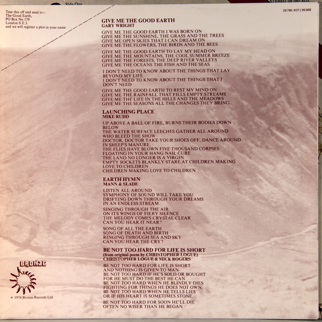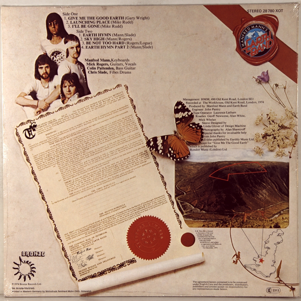 MANFRED MANN'S EARTH BAND-THE GOOD EARTH-1974-ОРИГИНАЛЬНЫЙ ПРЕСС 1977 GERMANY-BRONZE-28 780 XOT. матрицы A-1/B-1, The Good Earth — пятый студийный альбом британской рок-группы Manfred Mann’s Earth Band, выпущенный 11 октября 1974 года лейблом «Bronze Records» в Великобритании и лейблом «Warner Bros. Records» в США. Диск поднялся до #157 в Billboard 200 всех альбомов рок иерархии.