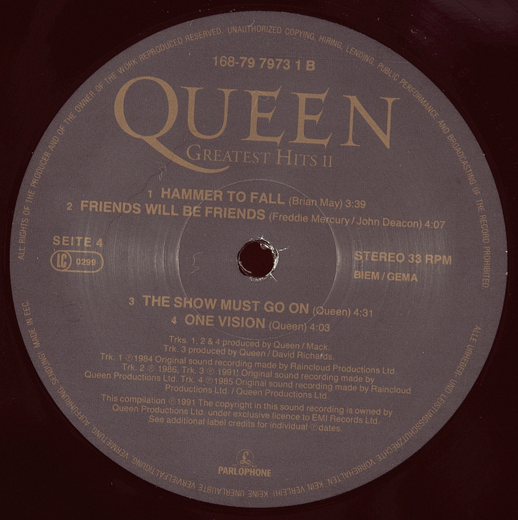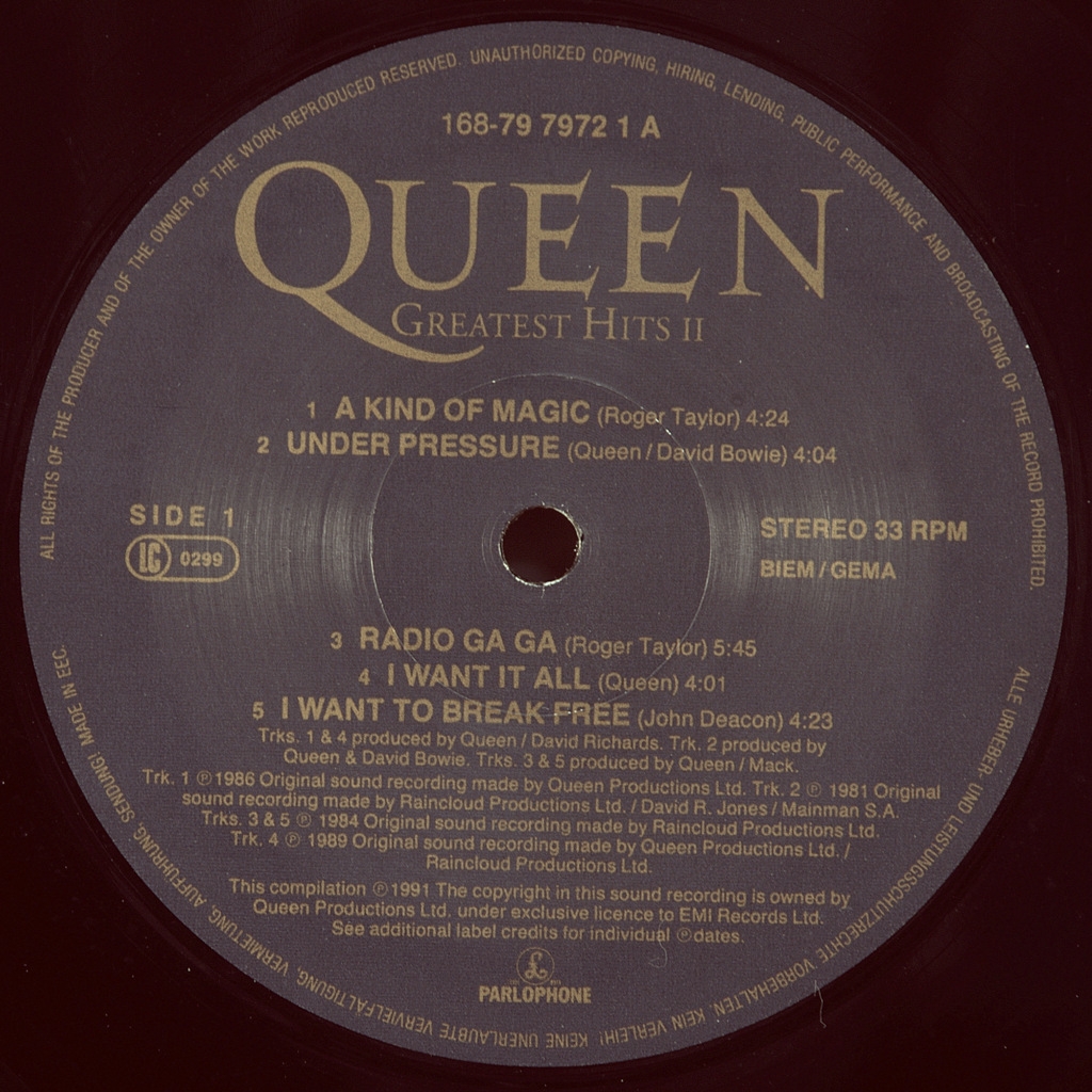 QUEEN-GREATEST HITS II-1991-ПЕРВЫЙ ПРЕСС GERMANY-PARLOPHONE-168-7979731 Очень редкий европейский оригинал. Greatest Hits II — второй сборник хитов британской группы Queen. Был выпущен 28 октября 1991 года, за месяц до смерти Фредди Меркьюри. В диски попали песни с 1980–1991 года (за исключением "These Are the Days of Our Lives"). Альбом сразу же оказался на первом месте, к концу года став третьим по популярности альбомом 1991 года