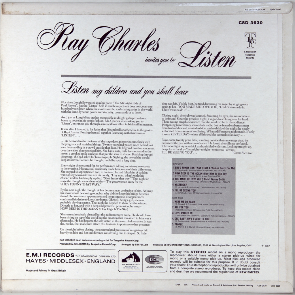 RAY CHARLES-INVITES YOU TO LISTEN- 1967-ПЕРВЫЙ ПРЕСС UK-HMV-CSD3630. Редкий британский оригинал культового альбома. После выхода в 1967 году альбома с лучшими хитами Рэя Чарльза A Man and His Soul он вернулся в студию звукозаписи, чтобы начать работу над Ray Charles Invites You to Listen. Продюсером альбома был Джо Адамс. Чарльз использовал фальцет в альбоме «исключительно ради собственного удовольствия». Ray Charles Invites You to Listen состоит в основном из стандартов. Сид Феллер выбрал для альбома десять песен и написал к ним аранжировки. В двух песнях использовался биг-бэнд, а в остальных — четырнадцать струнных инструментов, восемь медных духовых инструментов, гитара, бас-гитара и ударные; Феллер дирижировал струнными, а Адамс сводил запись. Рэй Чарльз приглашает вас послушать кавер-версию The Beatles «Yesterday»; Чарльз намеренно записал песню хриплым голосом, чтобы название звучало как «даш-тердаи». Чарльз также перезаписал «People» Джула Стайна с тромбоном вампом