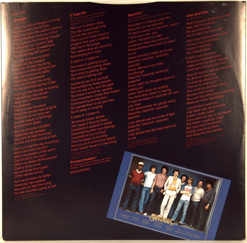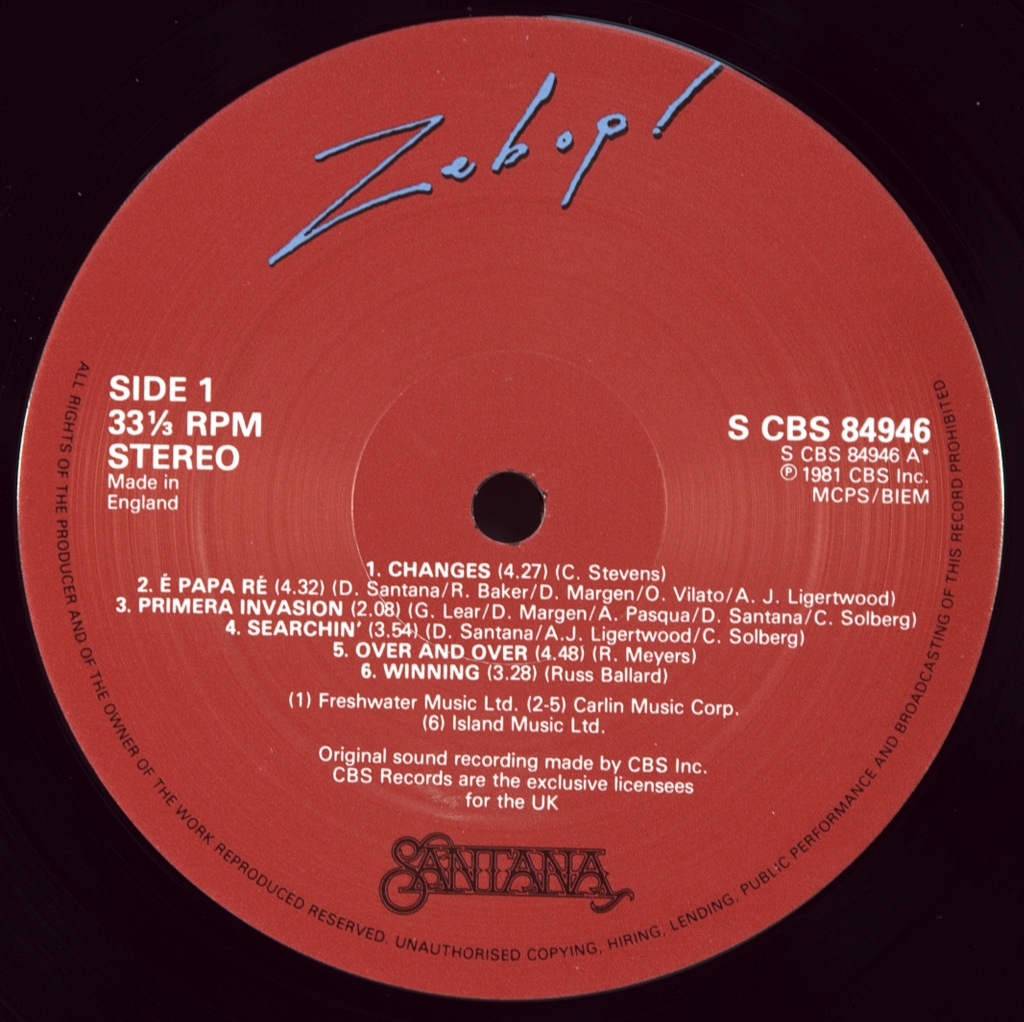 SANTANA-ZEBOP !-1981-ПЕРВЫЙ ПРЕСС UK-CBS-84946 Редкий британский оригинал легендарного гитариста. Zebop! — двенадцатый студийный альбом группы Santana, играющей латинский рок во главе с гитаристом Карлосом Сантаной, вышедший 29 апреля 1981 года. Диск выпускался несколько раз с разным цветовым фоном обложки, включая красный и розовый цвета. Сингл «Winning» из этого альбома, был одним из лучших последних хитов Сантаны до выхода альбома Supernatural.